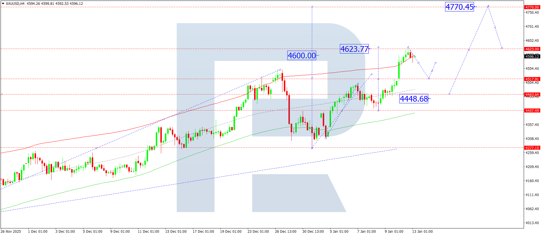 On the XAUUSD H4 chart, the market has broken above the 4,500 level and completed an upward wave to 4,624. Prices are expected to undergo a correction towards 4,520 (testing from above) today, 13 January 2026, before rising later to 4,770, a local target.