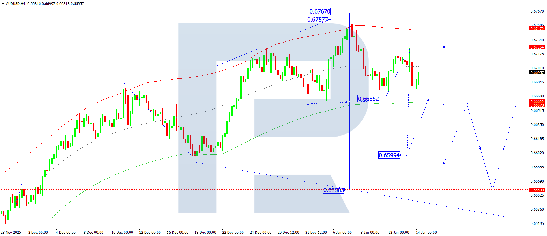 On the AUDUSD H4 chart, the market is forming a consolidation range around the 0.6700 level. Today, 14 January 2026, an upward leg towards 0.6733 is expected. Further decline towards the 0.6600 level is then expected, with the prospect of trend continuation to 0.6560.