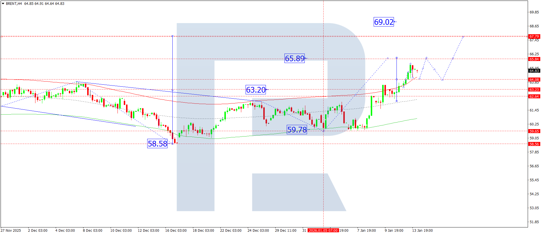 On the Brent H4 chart, the market is forming an upward wave towards the 65.84 level. Today, 14 January 2026, prices are expected to reach this target level. Further, quotes could correct towards 64.00 and develop a consolidation range around these levels. A breakout below the range could extend the correction towards the 63.00 level. Conversely, an upward breakout would open the potential for an upward wave towards the 69.00 level.