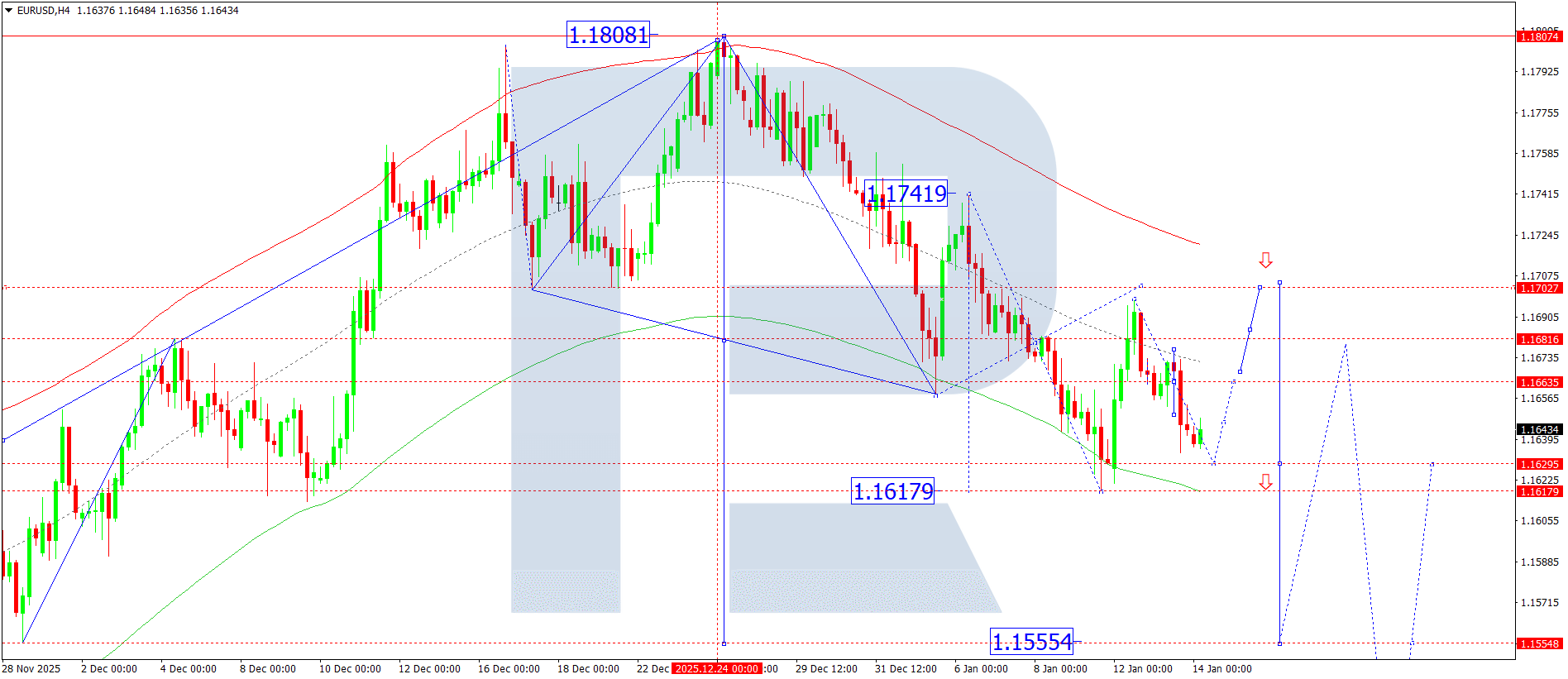 On the EURUSD H4 chart, the market formed a consolidation range around the 1.1665 level and, after breaking the low, continues to develop a downward wave towards the 1.1629 level. Today, 14 January 2026, the pair is expected to reach this target. Further, another upward leg towards 1.1665 is possible. If this level breaks upwards, growth towards 1.1700 could follow. At this point, the corrective potential will be exhausted. After this correction is complete, a new downward impulse towards the 1.1555 level is expected. This is the first target.
