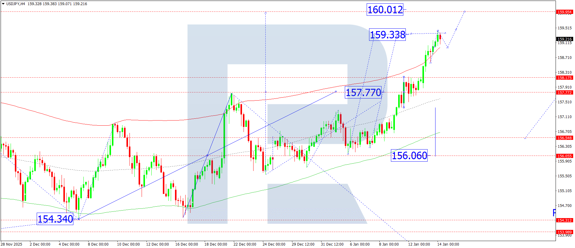 On the USDJPY H4 chart, the market broke above 158.18 and completed a wave towards the 159.33 level. Today, 14 January 2026, a corrective move towards the 159.00 level (testing from above) is possible. After that, growth towards 160.00 could follow.