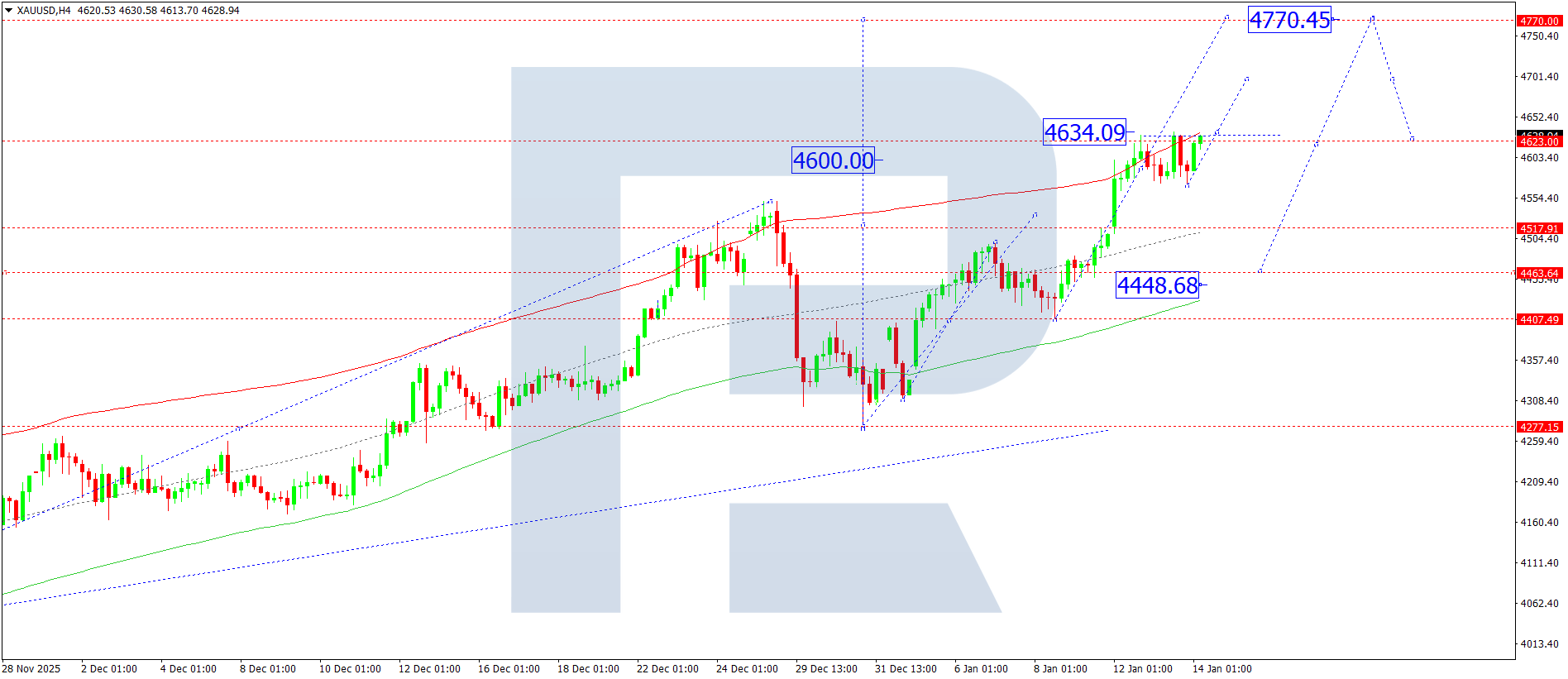 On the XAUUSD H4 chart, the market broke above the 4,644 level and continues the upward wave towards 4,770. Today, 14 January 2026, this target level is expected to be reached. This is a local target. Further, a correction towards the 4,633 level could begin.