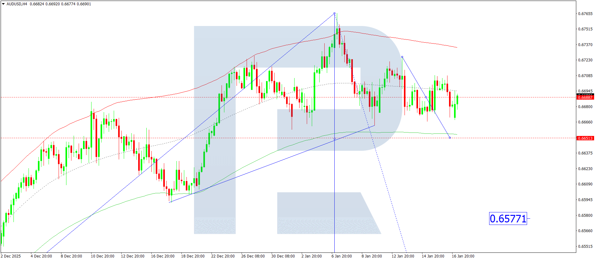 On the AUDUSD H4 chart, the market is forming a consolidation range around the 0.6700 level. Today, 19 January 2026, the range expanded downwards to 0.6667 and upwards to 0.6700. After that, a downward wave could start, targeting 0.6650. A breakout below this level would open the door for a wave towards 0.6595.