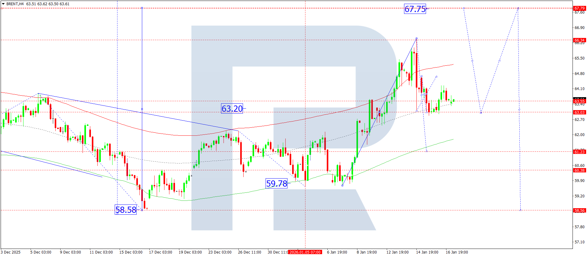 On the Brent H4 chart, the market is forming a consolidation range around the 63.85 level. Today, 19 January 2026, a corrective wave could develop towards 61.30, with an upward wave towards the 67.75 level likely to follow.