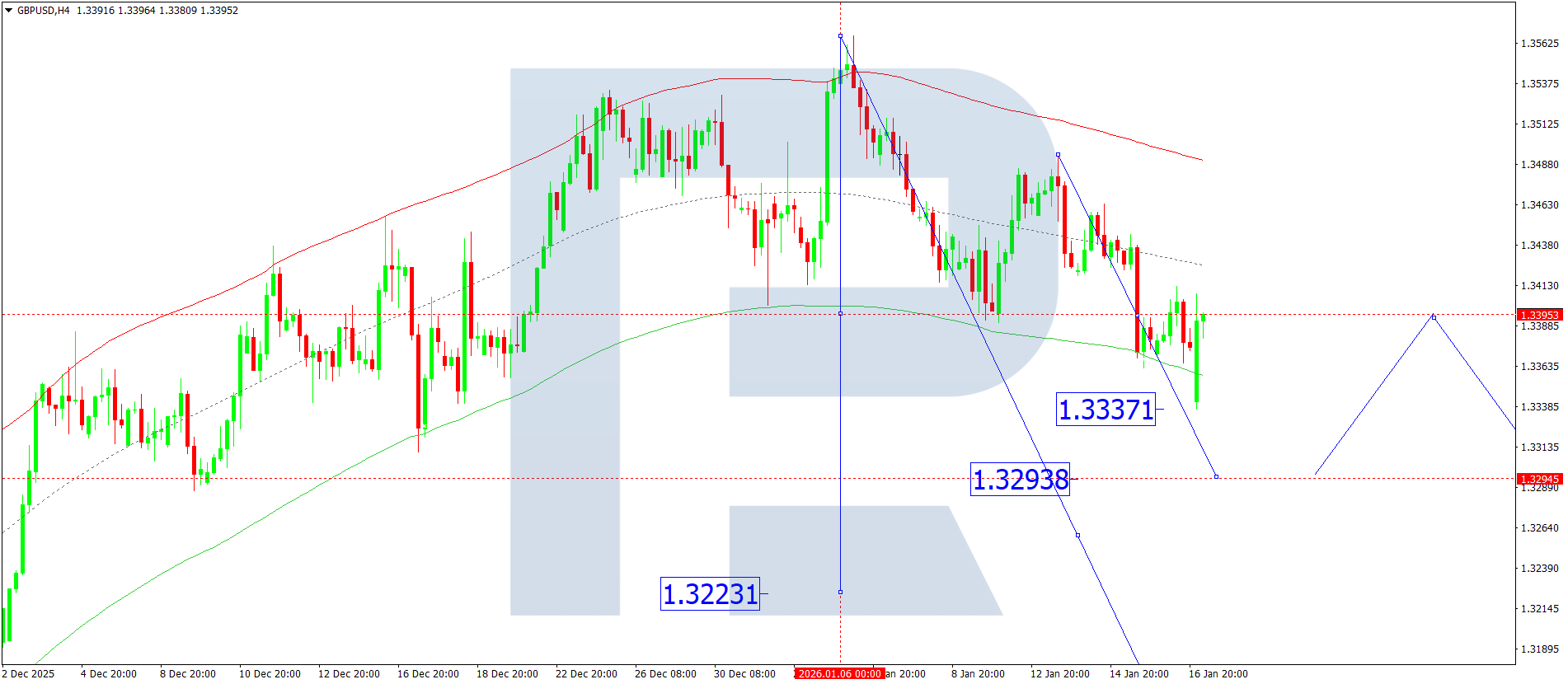 On the GBPUSD H4 chart, the market completed a downward wave to the 1.3337 level. Today, 19 January 2026, a consolidation range is expected to develop around the 1.3393 level. In the event of an upward breakout, a corrective move towards the 1.3411 level remains possible. Conversely, a downward breakout would open the potential for a wave towards 1.3293.