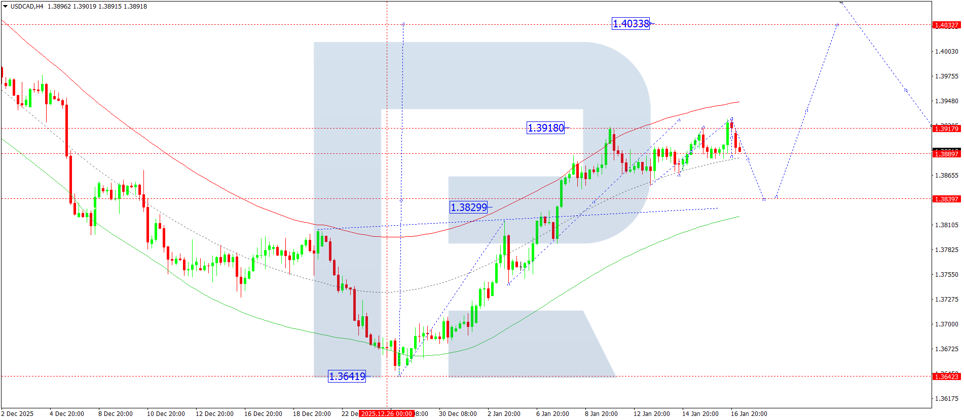 On the USDCAD H4 chart, the market is forming a consolidation range around the 1.3883 level. Today, 19 January 2026, the range may expand downwards to 1.3838 and upwards to the 1.3890 level. In the event of an upward breakout of this level, a new upward wave could start, aiming for the 1.4010 level as the first target.