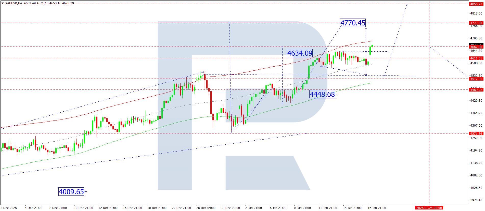 On the XAUUSD H4 chart, the market has broken above the 4,646 level and continues to develop an upward wave towards the 4,770 level. Today, 19 January 2026, prices are expected to reach this target level. Further, a corrective move towards the 4,650 level remains possible, followed by growth towards 4,855.