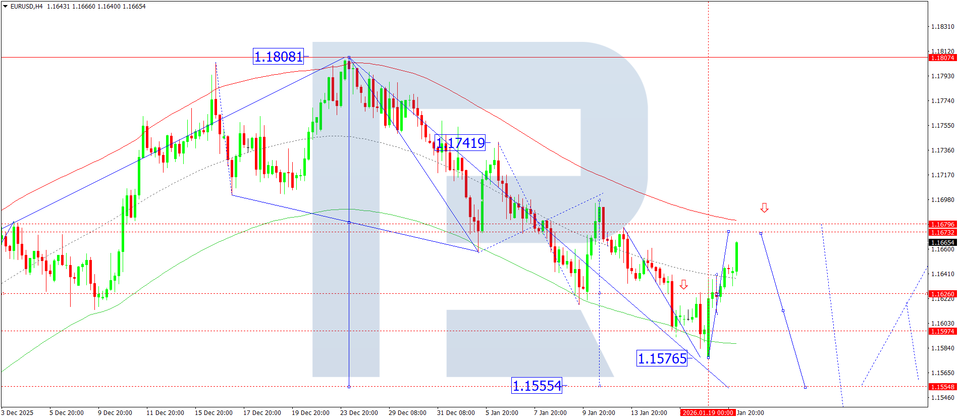 On the EURUSD H4 chart, the market is forming an upward wave towards 1.1675. Today, 20 January 2026, the price could reach this target level. Further, a downward wave towards the 1.1620 level might develop, potentially extending towards 1.1555 as the first target.