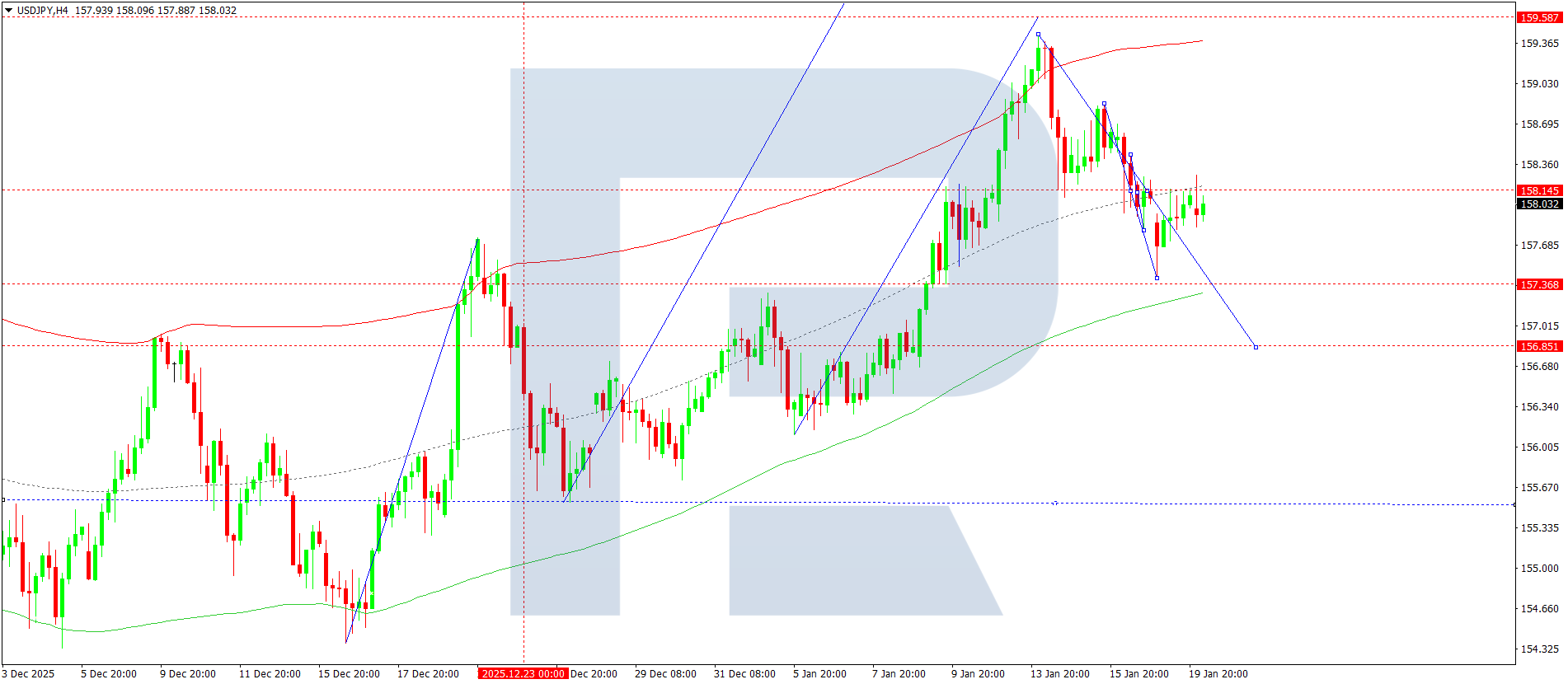 On the USDJPY H4 chart, the market completed an upward wave to the 157.15 level. Today, 20 January 2026, the price is expected to dip towards the 156.85 level. Further, another upward move towards 158.00 remains possible, possible extneding towards 160.00.
