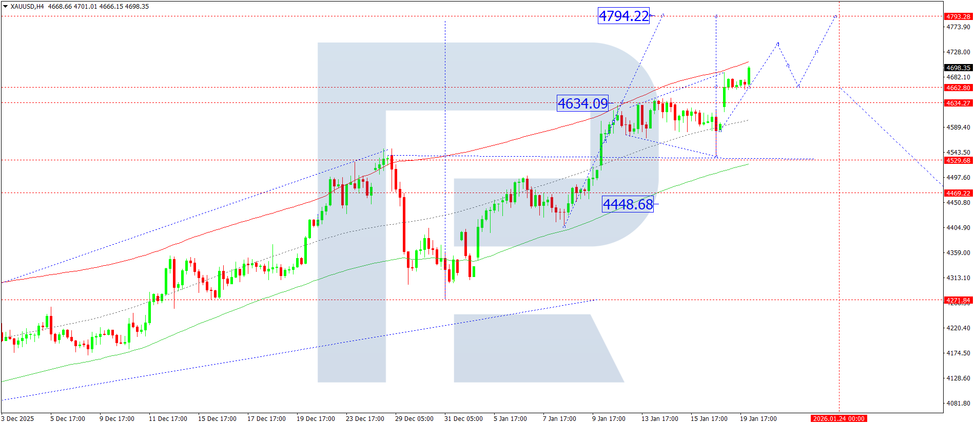On the XAUUSD H4 chart, the market broke above the 4,686 level and continues to develop an upward wave towards 4,790. Today, 20 January 2026, prices are expected to reach this target level. Further, a corrective move towards the 4,686 level remains possible. After that, growth towards the 4,855 level is expected.