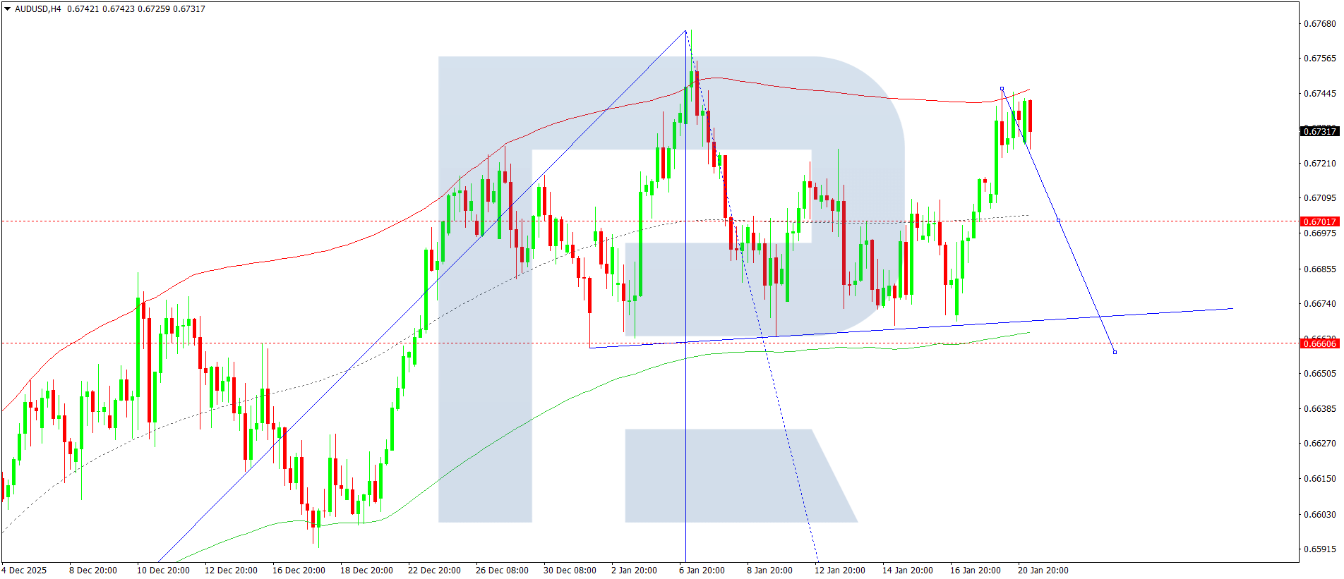 On the AUDUSD H4 chart, the market is forming a consolidation range around the 0.6730 level. Today, 21 January 2026, the range expanded upwards to 0.6745. After that, a downward wave might begin, targeting 0.6700, with a breakout below this level potentially opening the door for a wave towards 0.6666.
