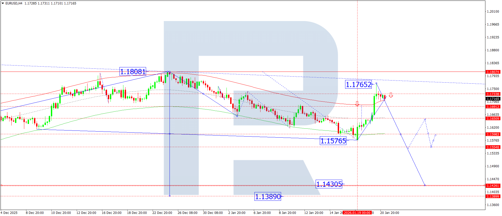 On the EURUSD H4 chart, the market is forming a consolidation range below the 1.1765 level. Today, 21 January 2026, a downside breakout from this range is likely, with the target at 1.1650. If this level breaks, potential opens for a decline towards 1.1598.