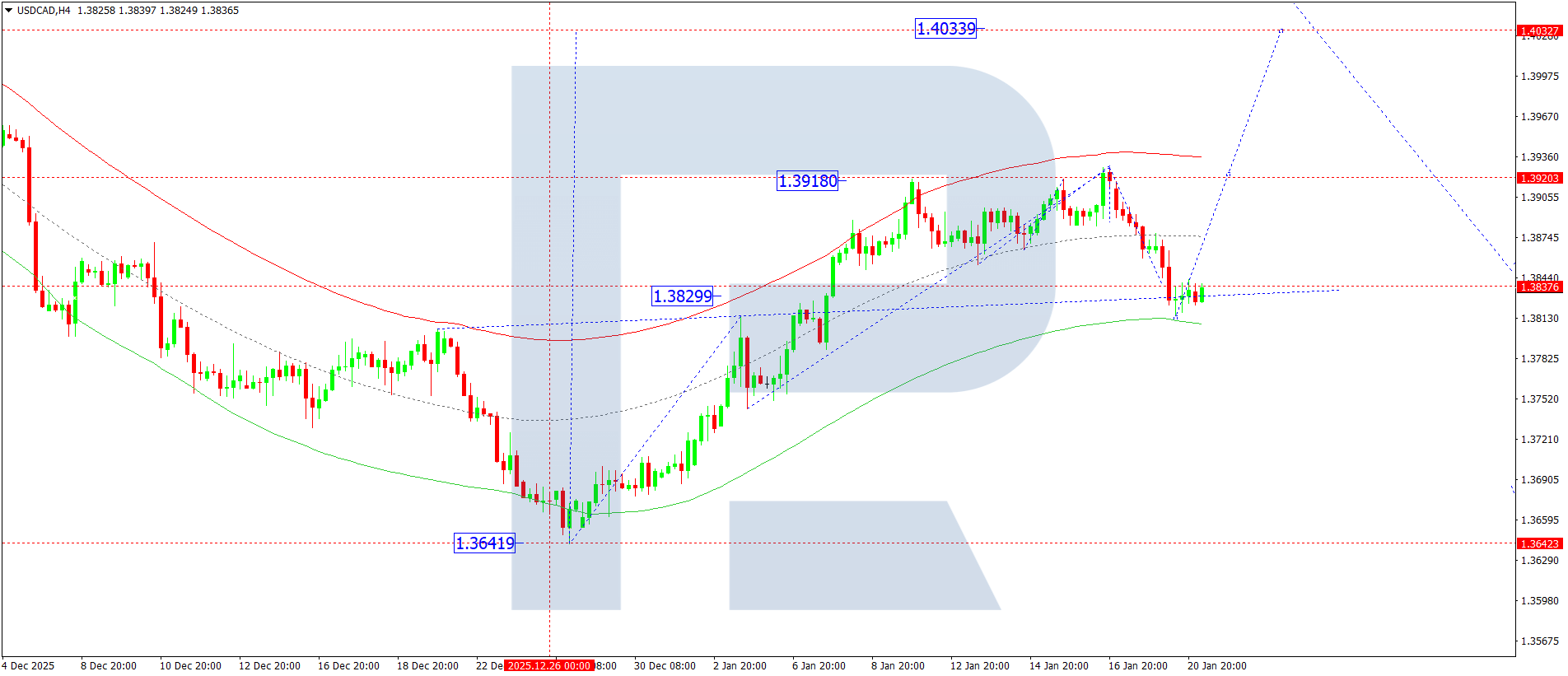 On the USDCAD H4 chart, the market completed a downward wave to the 1.3815 level. Today, 21 January 2026, a new upward wave towards the 1.3920 level is expected, potentially extending towards 1.4010 as the first target.