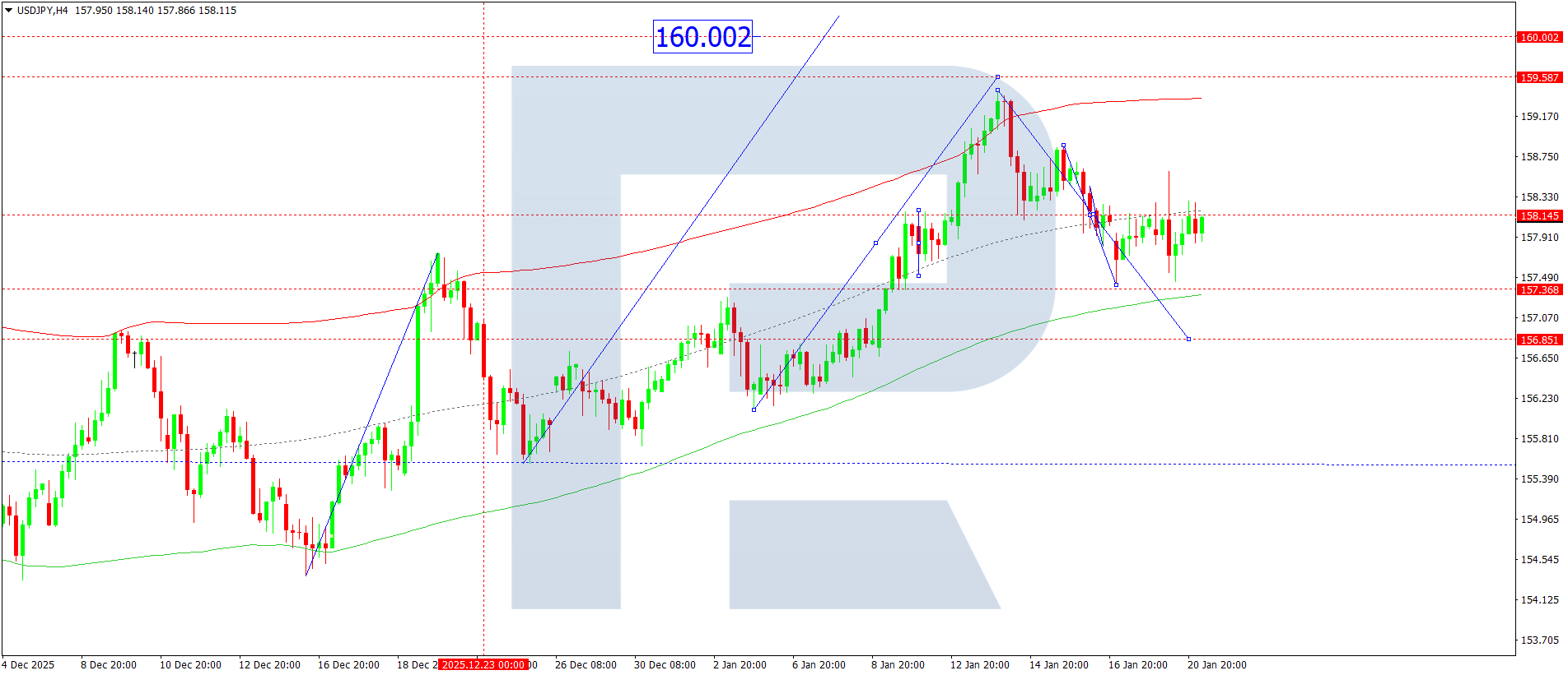 On the USDJPY H4 chart, the market continues to develop a consolidation range around the 158.15 level. Today, 21 January 2026, a downside breakout from the range could open the potential for a wave towards 156.81. Conversely, in the case of an upside breakout from the range, a move towards the 160.00 level might follow.