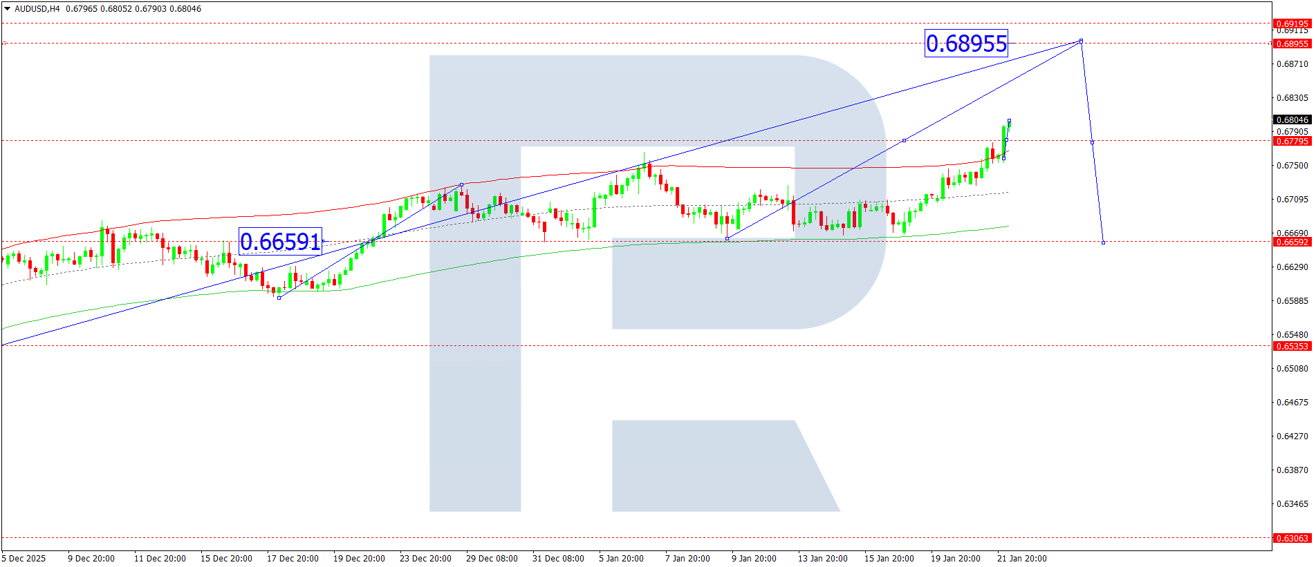 On the AUDUSD H4 chart, the market is forming a consolidation range around the 0.6777 level. Today, 22 January 2026, the range expanded upwards to 0.6800. Subsequently, a downward wave towards 0.6777 could begin, potentially followed by growth towards the 0.6890 level.