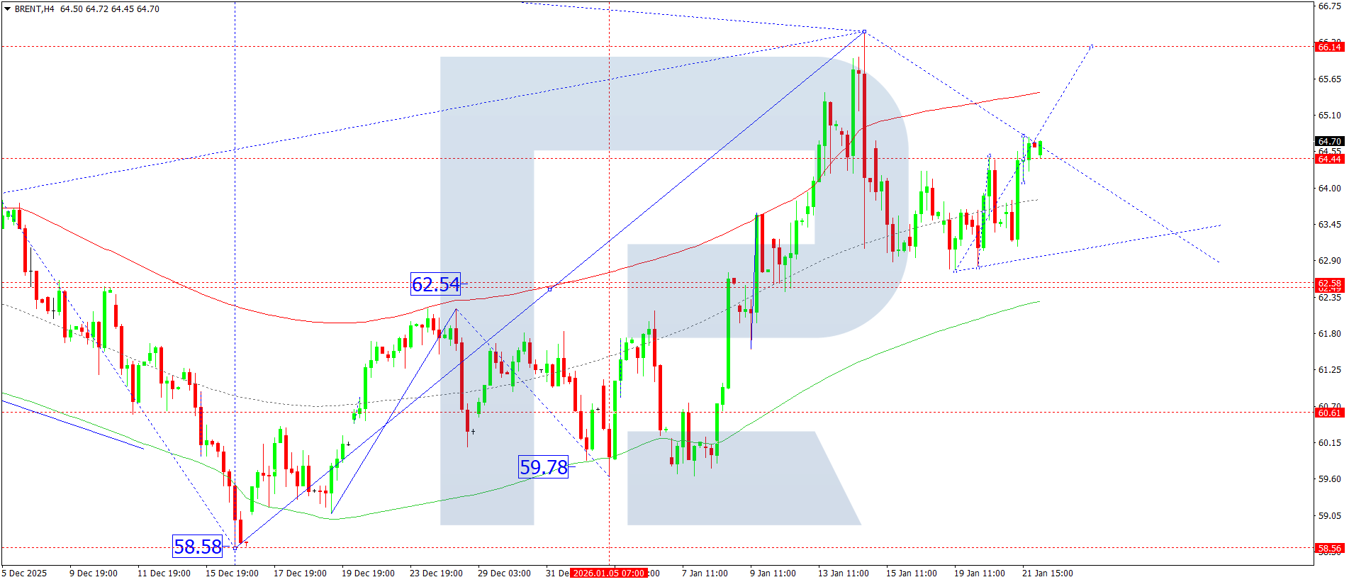 On the Brent H4 chart, the market is forming a consolidation range around the 64.44 level. Today, 22 January 2026, a corrective wave towards 64.00 cannot be ruled out. Further, an upward wave might begin, aiming for the 66.75 level.
