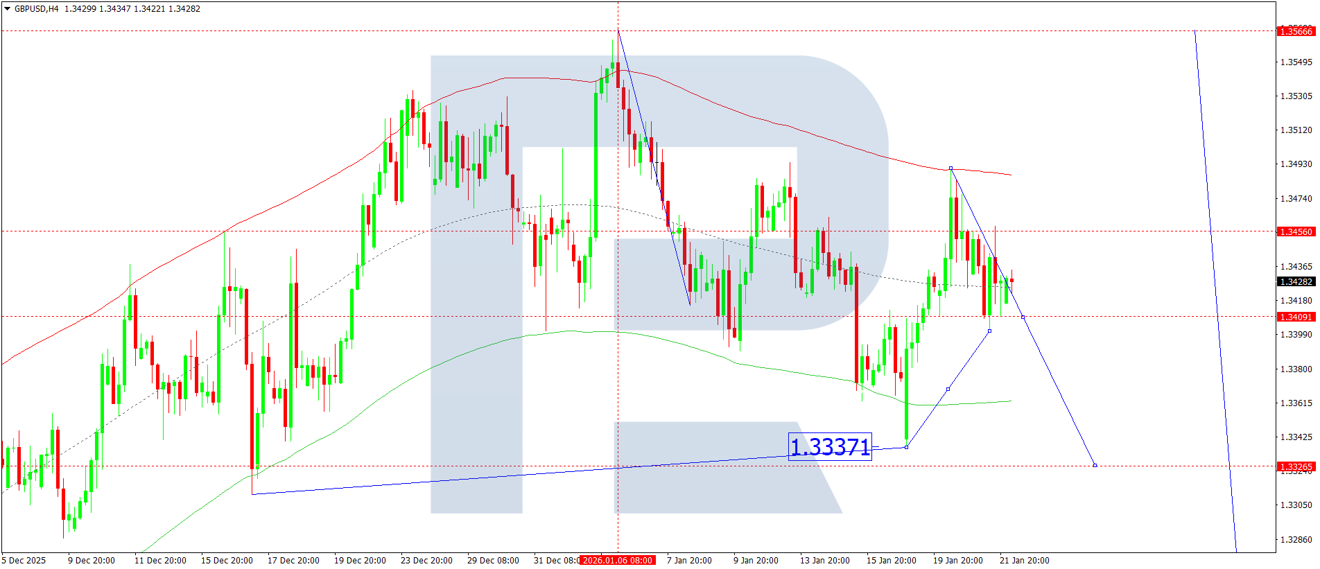 On the GBPUSD H4 chart, the market is forming a consolidation range around the 1.3434 level. Today, 22 January 2026, a downward wave towards 1.3326 is expected. A breakout below this level would pave the way for a wave towards 1.3260.
