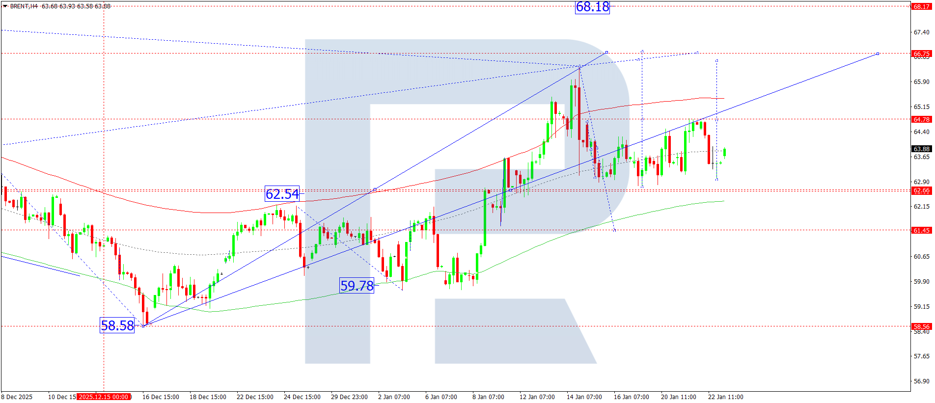On the Brent H4 chart, the market is forming a consolidation range around the 63.80 level. Today, 23 January 2026, an upward wave towards the 64.70 level is possible. A breakout above this level would open the door for a continued wave towards the 66.75 level.