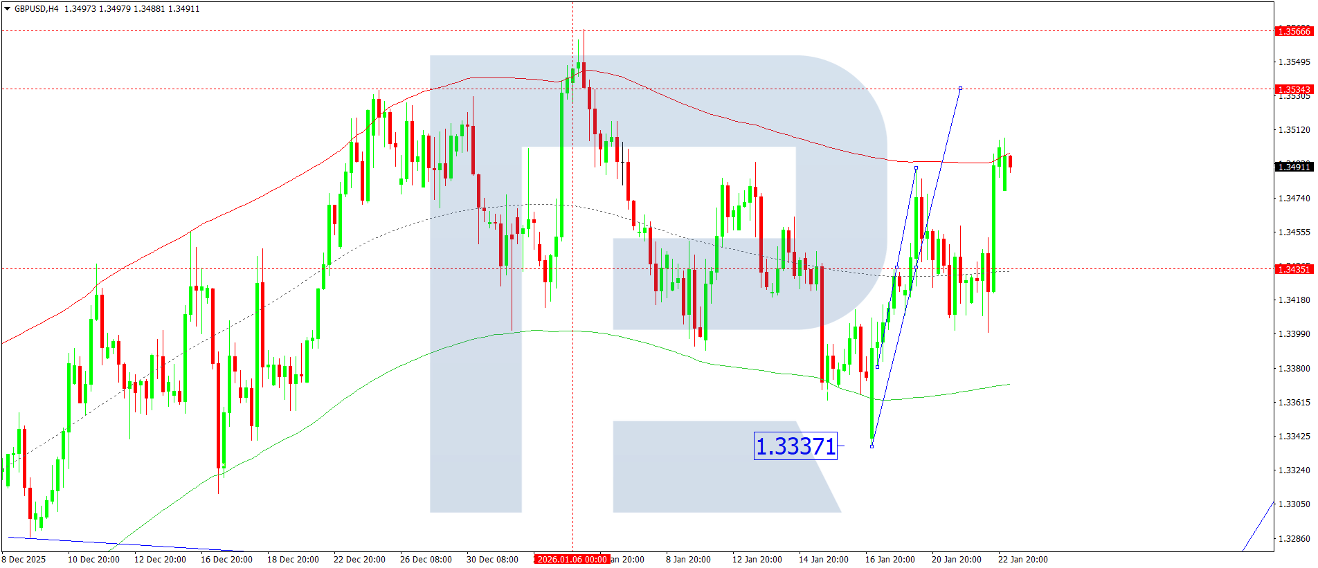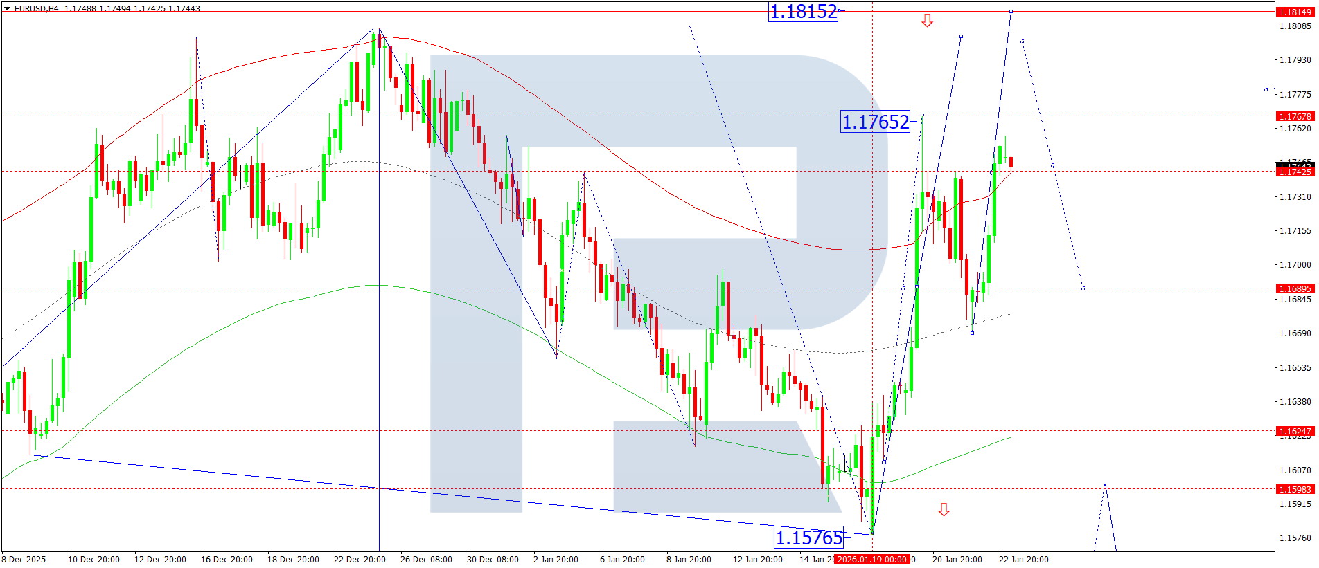 On the EURUSD H4 chart, the market has broken above 1.1745 and is forming a consolidation range around this level. Today, 23 January 2026, growth could continue towards 1.1800, potentially extending to 1.1815.