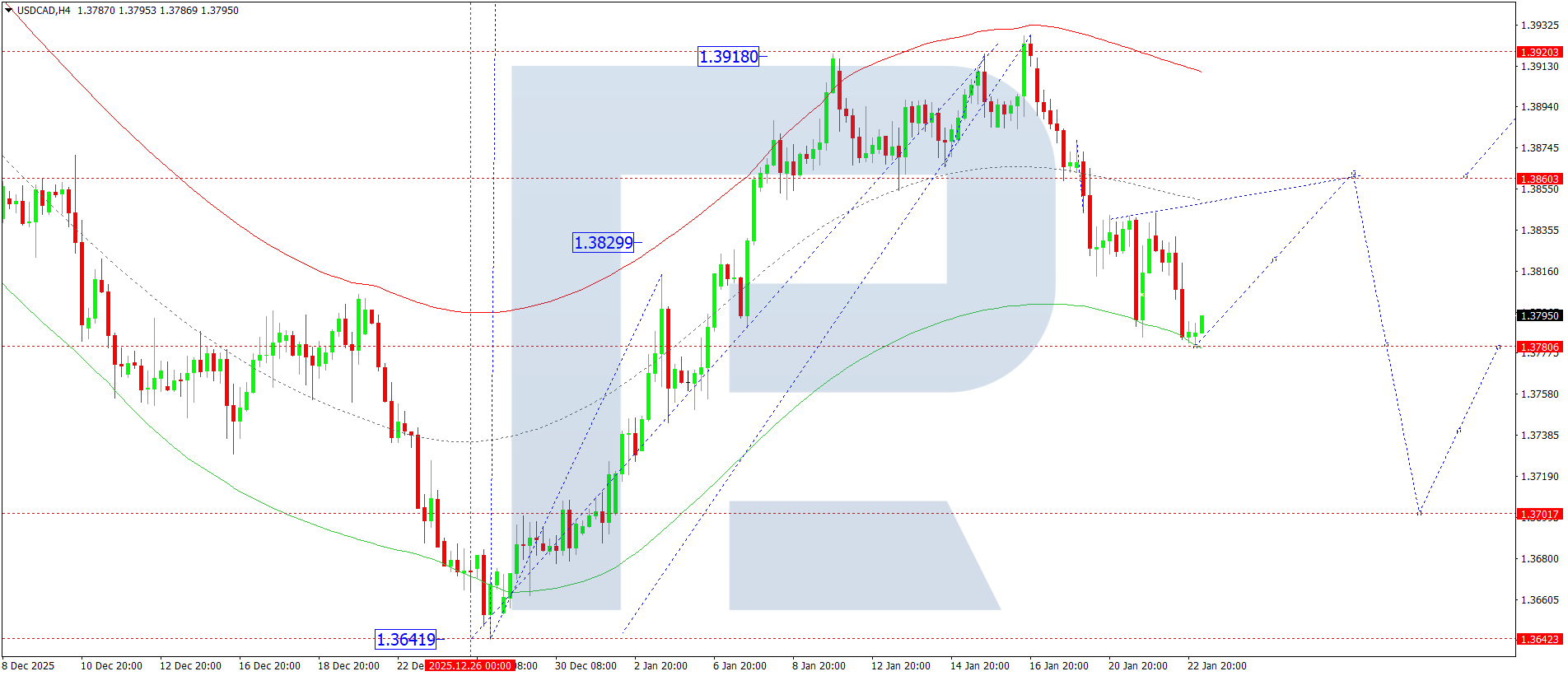 On the USDCAD H4 chart, the market completed a downward wave to the 1.3780 level. Today, 23 January 2026, an upward wave towards the 1.3860 level is expected. Further, the pair could dip to 1.3700.