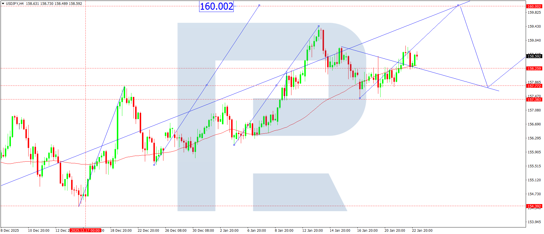 On the USDJPY H4 chart, the market continues to develop a consolidation range around the 158.51 level. Today, 23 January 2026, an upside breakout from the range would open the potential for a wave towards 160.00. Conversely, a downside breakout would trigger a wave towards the 157.77 level.