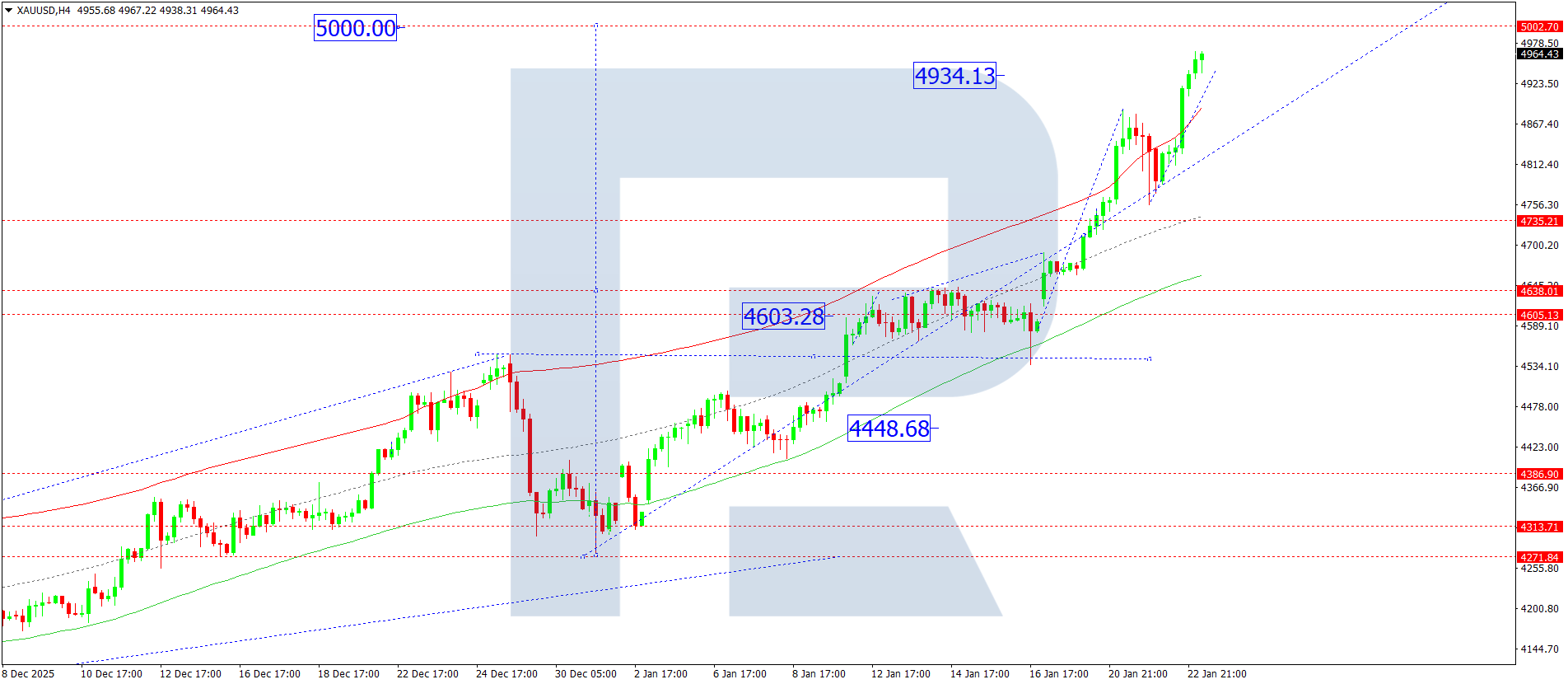 On the XAUUSD H4 chart, the market is forming an upward wave towards the 5,000 level. Today, 23 January 2026, prices are expected to reach this target level. Further, a corrective move towards the 4,800 level is possible, followed by growth towards the 4,900 level.