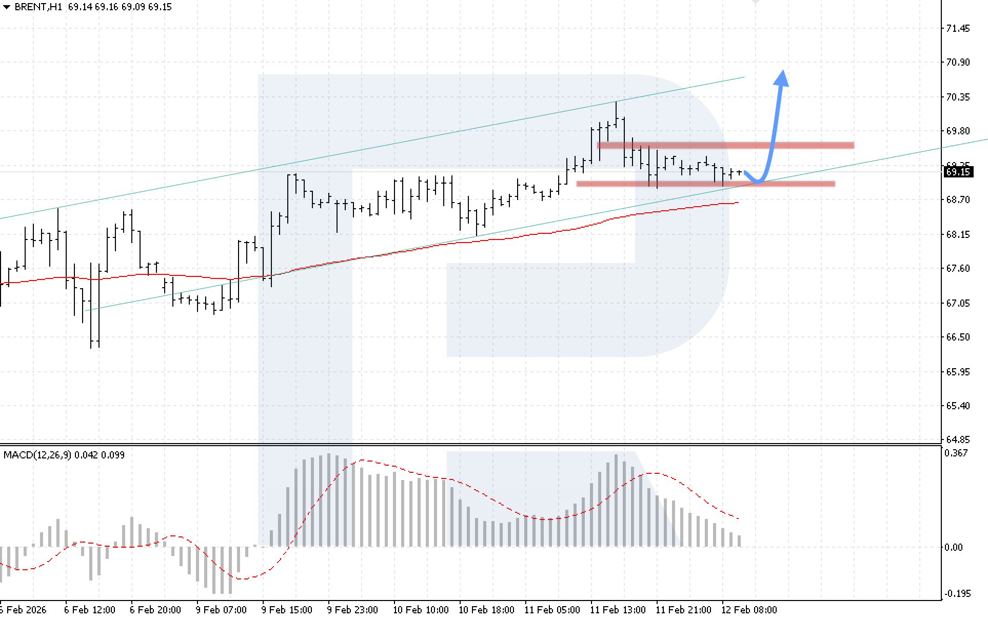 On the H4 chart of Brent crude oil, the market is correcting within a bullish channel, with buyers keeping prices above the EMA-85. There are still risks of a Double Bottom reversal pattern forming, as prices rebounded from the 69.00 support level for the second time. Today, 12 February 2026, the baseline scenario suggests continued upward movement after a rebound from the lower channel boundary, with a target at 70.85.