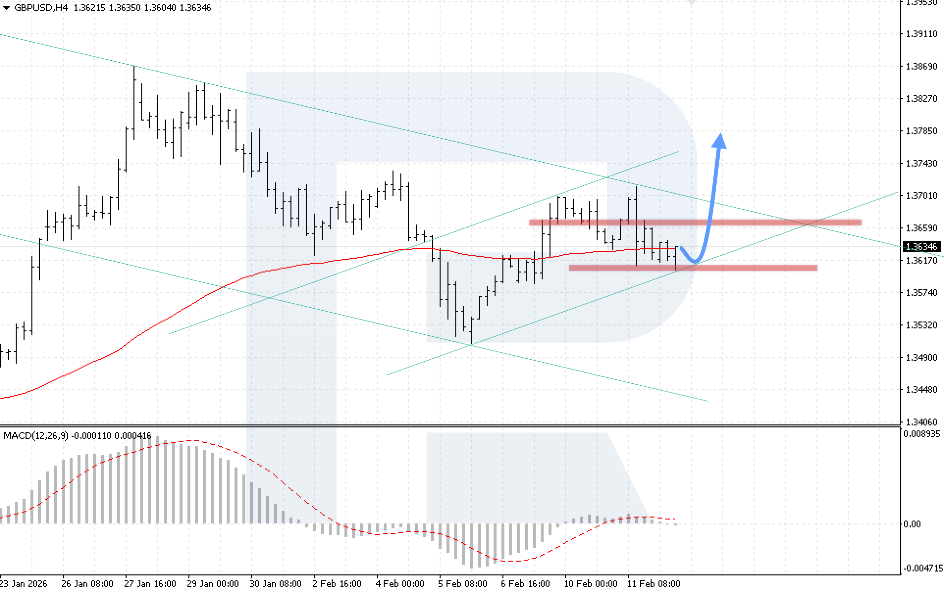 On the H4 chart of the GBPUSD currency pair, quotes continue to move within a correction, while buyers attempt to secure positions above the EMA-85. The nearest support level is located at 1.3605. Today, 12 February 2026, the baseline scenario suggests a rebound from the lower boundary of the bullish channel, followed by growth towards 1.3785.