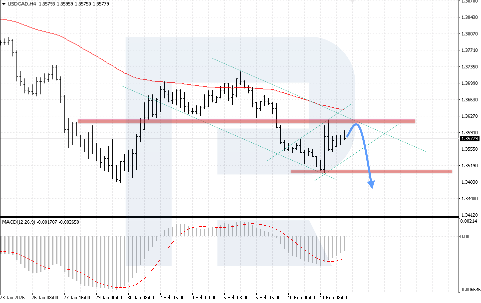 On the H4 chart of the USDCAD currency pair, the market continues to move within a bullish correction, while prices remain below the EMA-85, indicating persistent bearish pressure. Today, 12 February 2026, the baseline scenario suggests a continued decline with a target at 1.3475 after a rebound from the upper boundary of the descending channel at 1.3595.