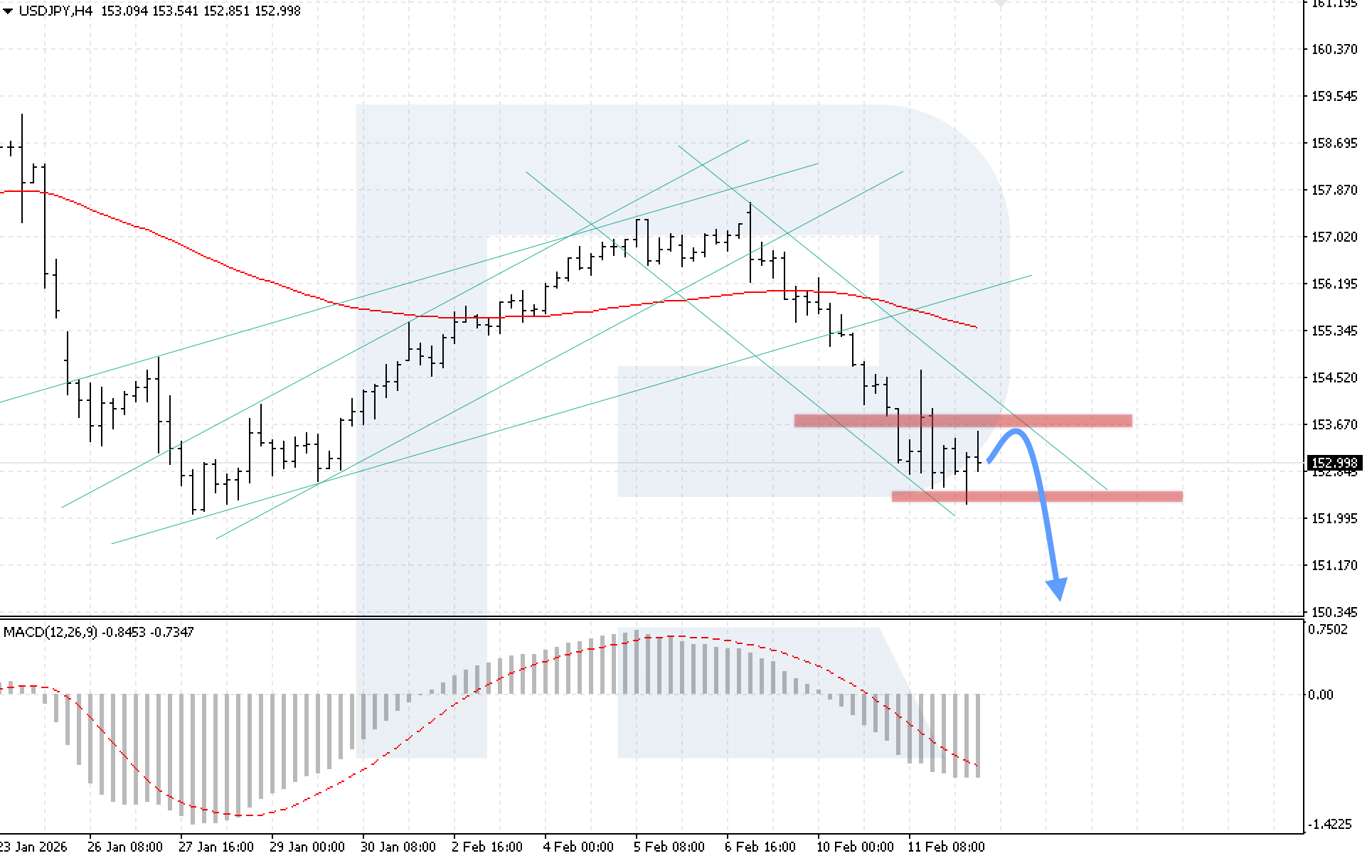 On the H4 chart of the USDJPY currency pair, the market is declining sharply within a descending channel after rebounding from the 153.65 resistance level. The nearest support zone is located at 152.15. Today, 12 February 2026, the baseline scenario suggests a continued decline towards a target of 150.55.