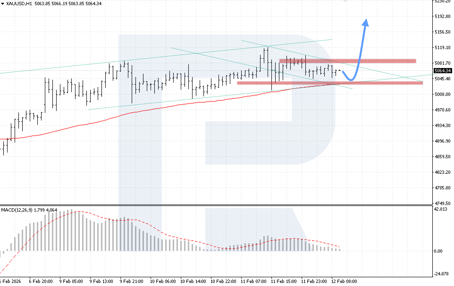 On the XAUUSD H4 chart, the market continues to move within consolidation. Prices are trapped between the 5,080 resistance level and the 5,040 support level. Today, 12 February 2026, the baseline scenario suggests continued growth after a rebound from local support, with a target at 5,195.
