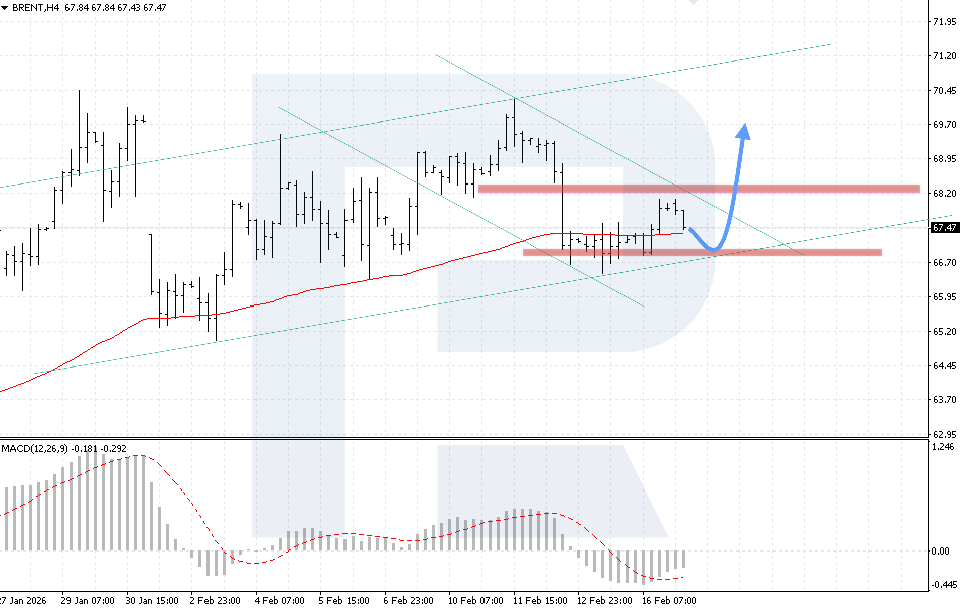 The technical picture confirms the bullish scenario. The MACD indicator shows histogram growth, and the signal line has moved out of the histogram area, strengthening the signal for continued upward movement. The key condition for growth will be consolidation above the 68.25 resistance level, confirming a breakout of the upper boundary of the descending channel.