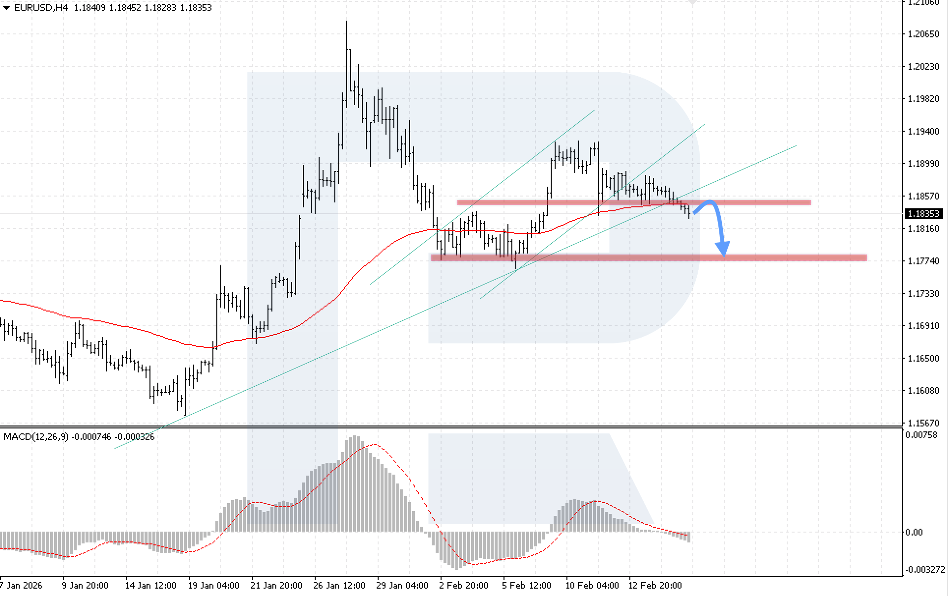 The technical picture confirms this scenario. The MACD histogram is contracting after crossing the zero line, signalling an increase in bearish momentum. The key condition for further decline will be firm consolidation below 1.1815.