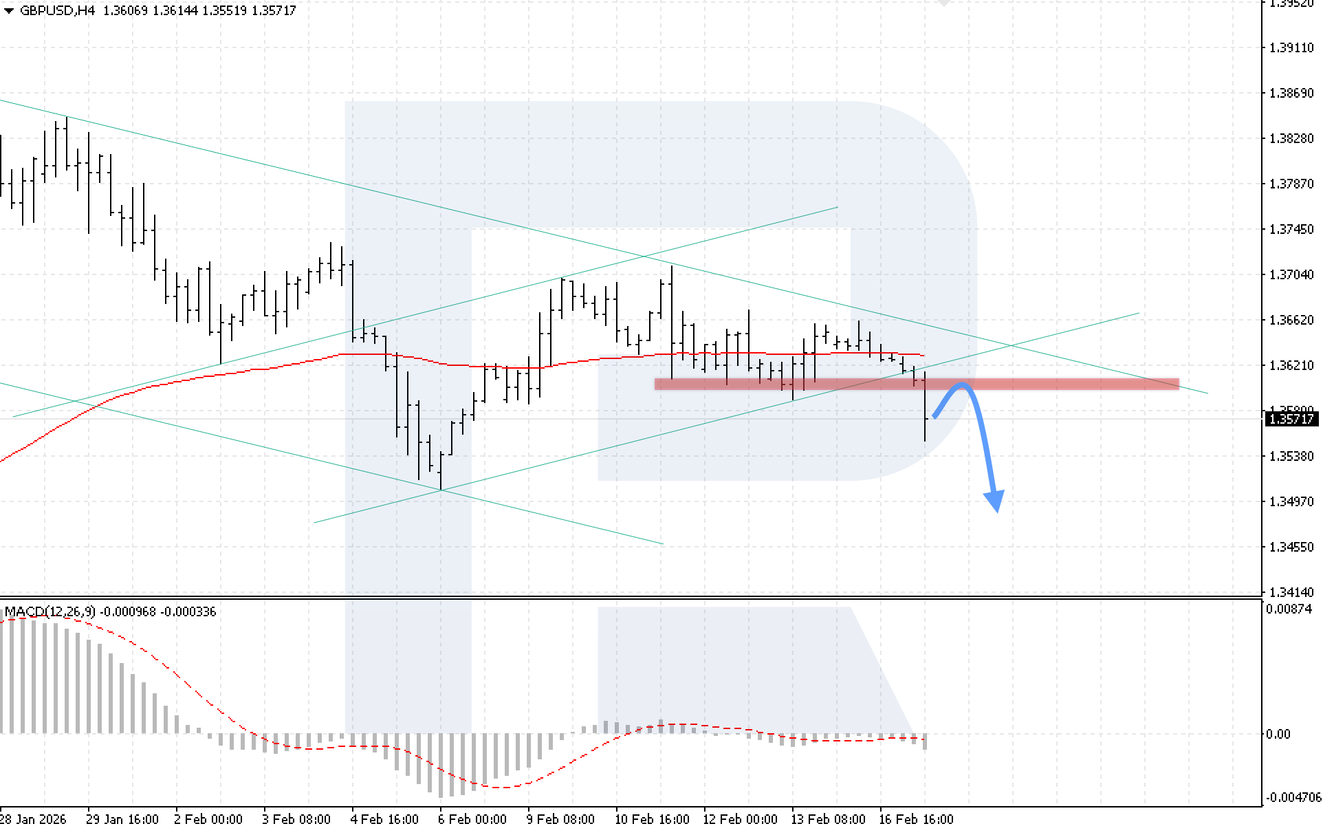 On the H4 chart of the GBPUSD currency pair, quotes are moving within an aggressive decline after breaking below the local support level at 1.3595. Today, 17 February 2026, the baseline scenario suggests a rebound from the broken resistance line, followed by a decline towards 1.3495.