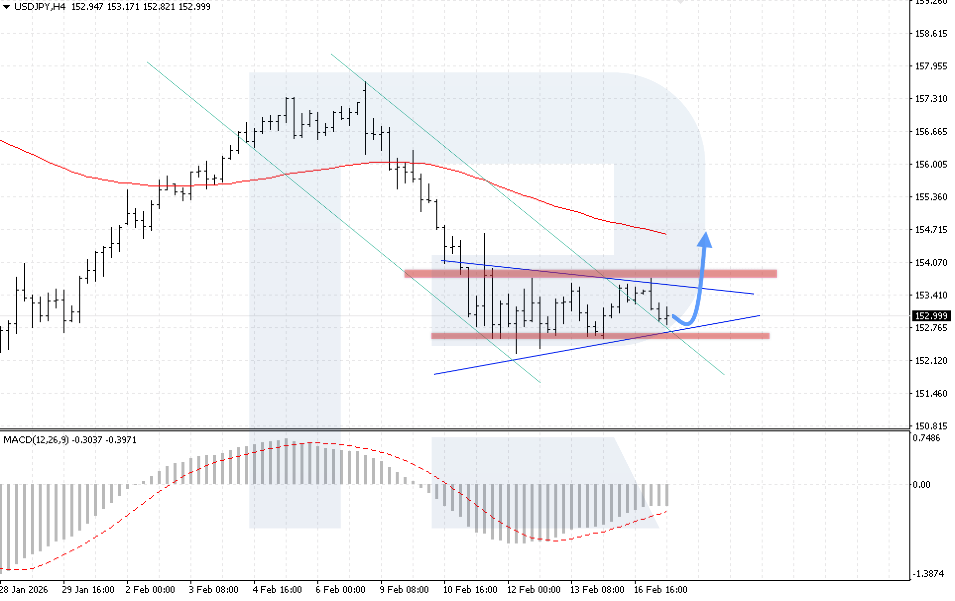 On the H4 chart of the USDJPY currency pair, the market continues to correct within a Triangle pattern. Sellers have retested the lower boundary of the formation, but no breakout has occurred. Today, 17 February 2026, the baseline scenario suggests a rebound from the lower boundary, followed by a bullish impulse towards 154.70.