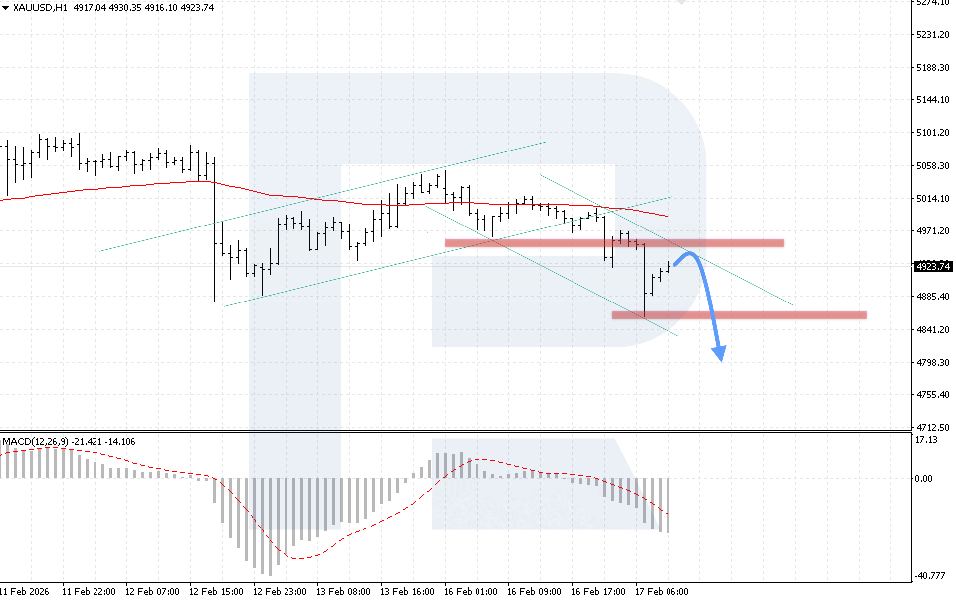 On the H1 chart of the XAUUSD currency pair, the market is correcting after an aggressive decline while remaining within a descending channel. Today, 17 February 2026, the baseline scenario suggests renewed bearish momentum after a rebound from the upper boundary of the channel, with a target at 4,795.