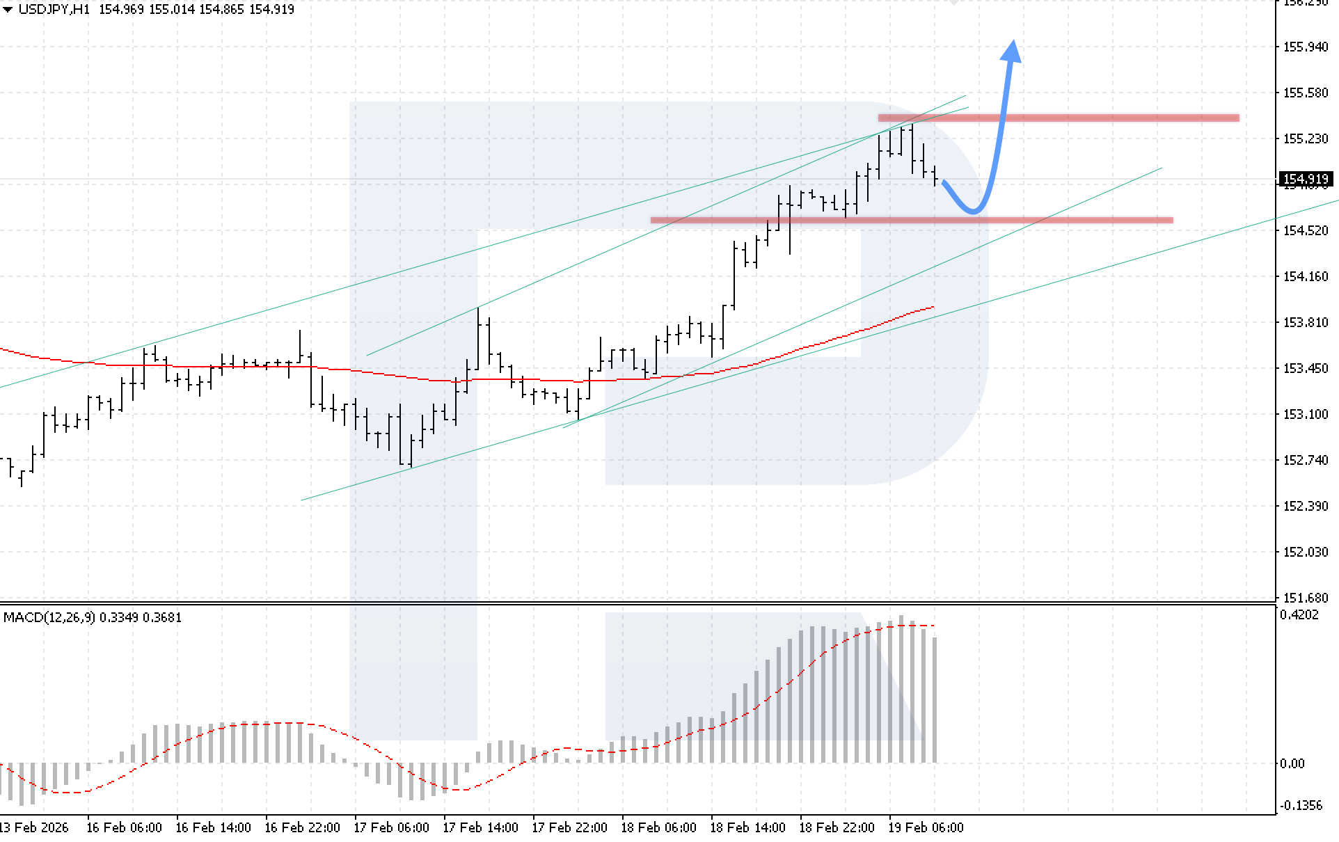 On the H1 chart of the USDJPY currency pair, the market is correcting after rebounding from the upper boundary of the bullish channel. Today, 19 February 2026, the baseline scenario suggests a decline towards the 154.65 support level, followed by renewed growth towards 155.95.