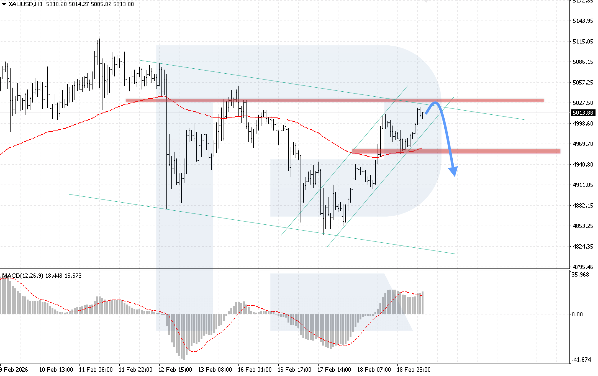 On the H1 chart of the XAUUSD currency pair, the market is rising confidently, with buyers testing the upper boundary of the descending channel. Today, 19 February 2026, the baseline scenario suggests a renewed decline after a rebound from the upper boundary of the channel at 5,035, with a target at 4,675.