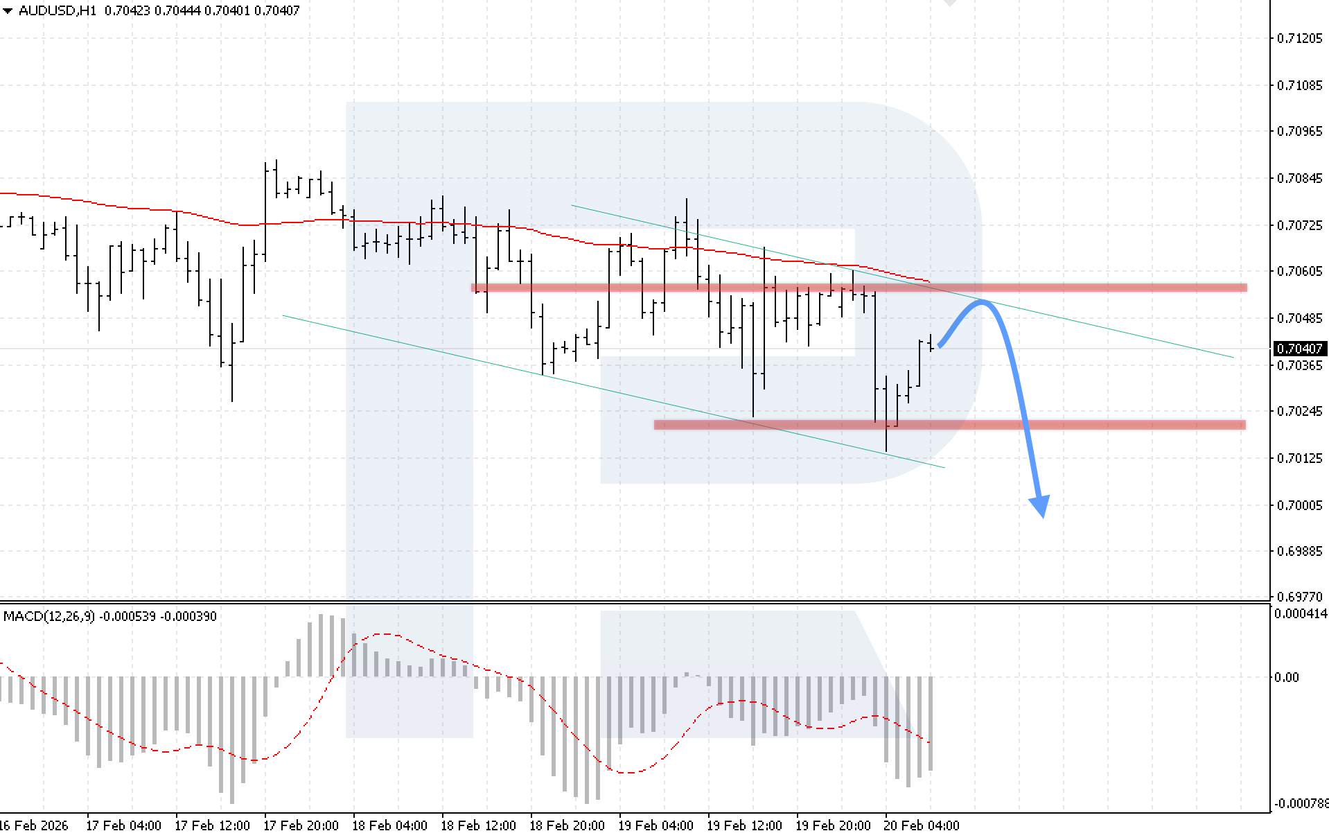 The H1 chart of the AUDUSD currency pair shows a correction after a rebound from the upper boundary of the descending channel. For today, 20 February 2026, the baseline scenario suggests further decline towards 0.7005.