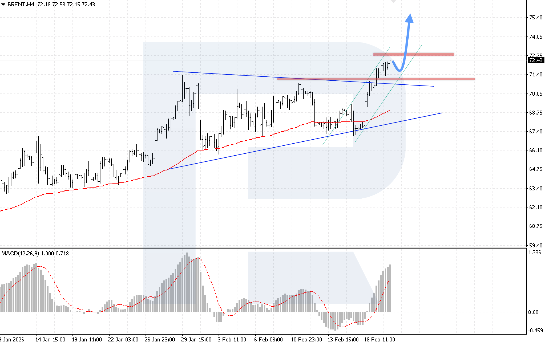 On the H4 chart of Brent crude oil, the market continues to rise actively after breaking above the upper boundary of the Triangle pattern. Buyers have confidently secured positions above the 71.35 resistance level. Today, 20 February 2026, the baseline scenario suggests a rebound from the lower boundary of the bullish channel, followed by growth towards 75.45.