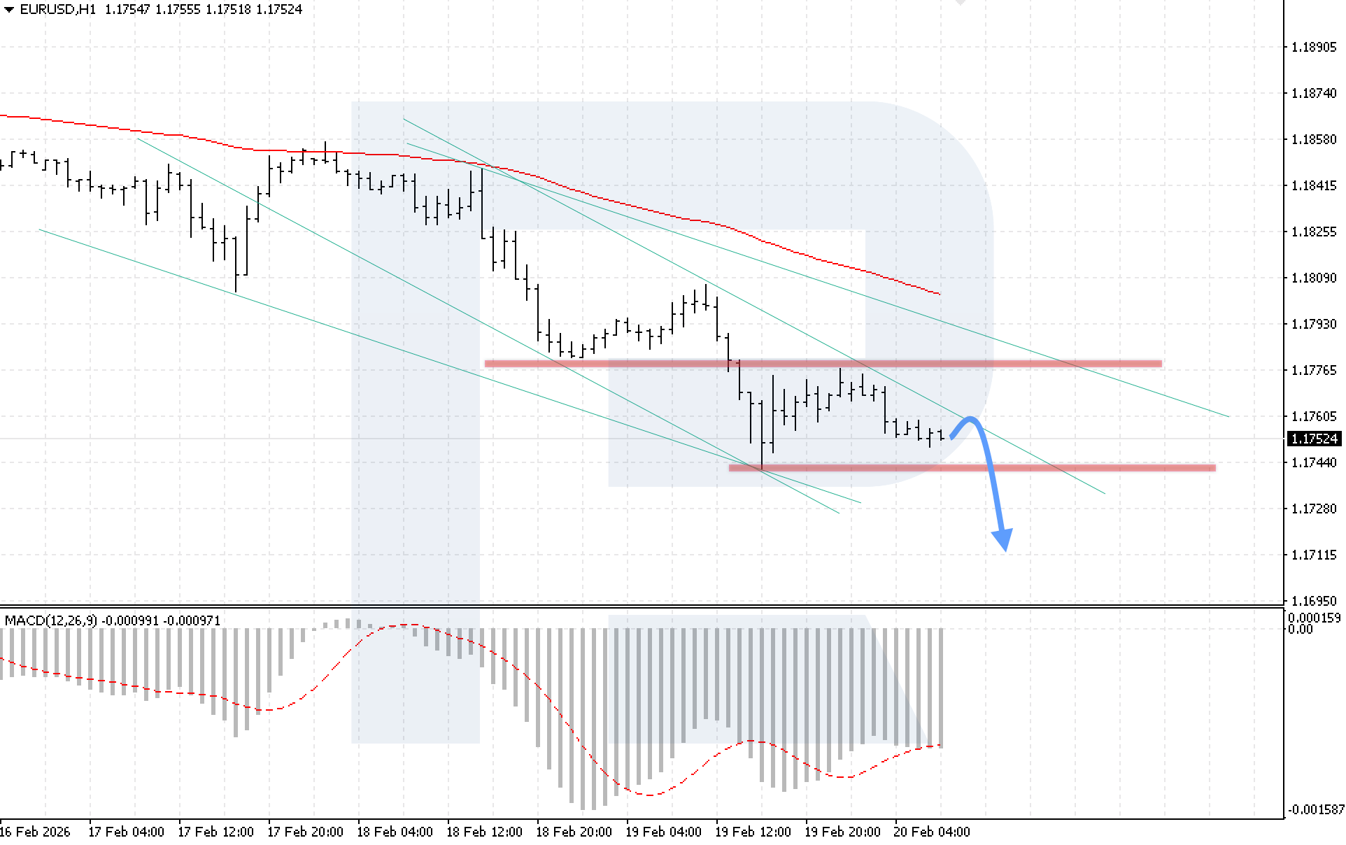 On the H1 chart of the EURUSD currency pair, the market continues its downward momentum despite the formation of a bullish divergence on MACD amid positive US data. Today, 20 February 2026, the baseline scenario remains a rebound from the upper boundary of the descending channel, followed by a decline towards 1.1710.