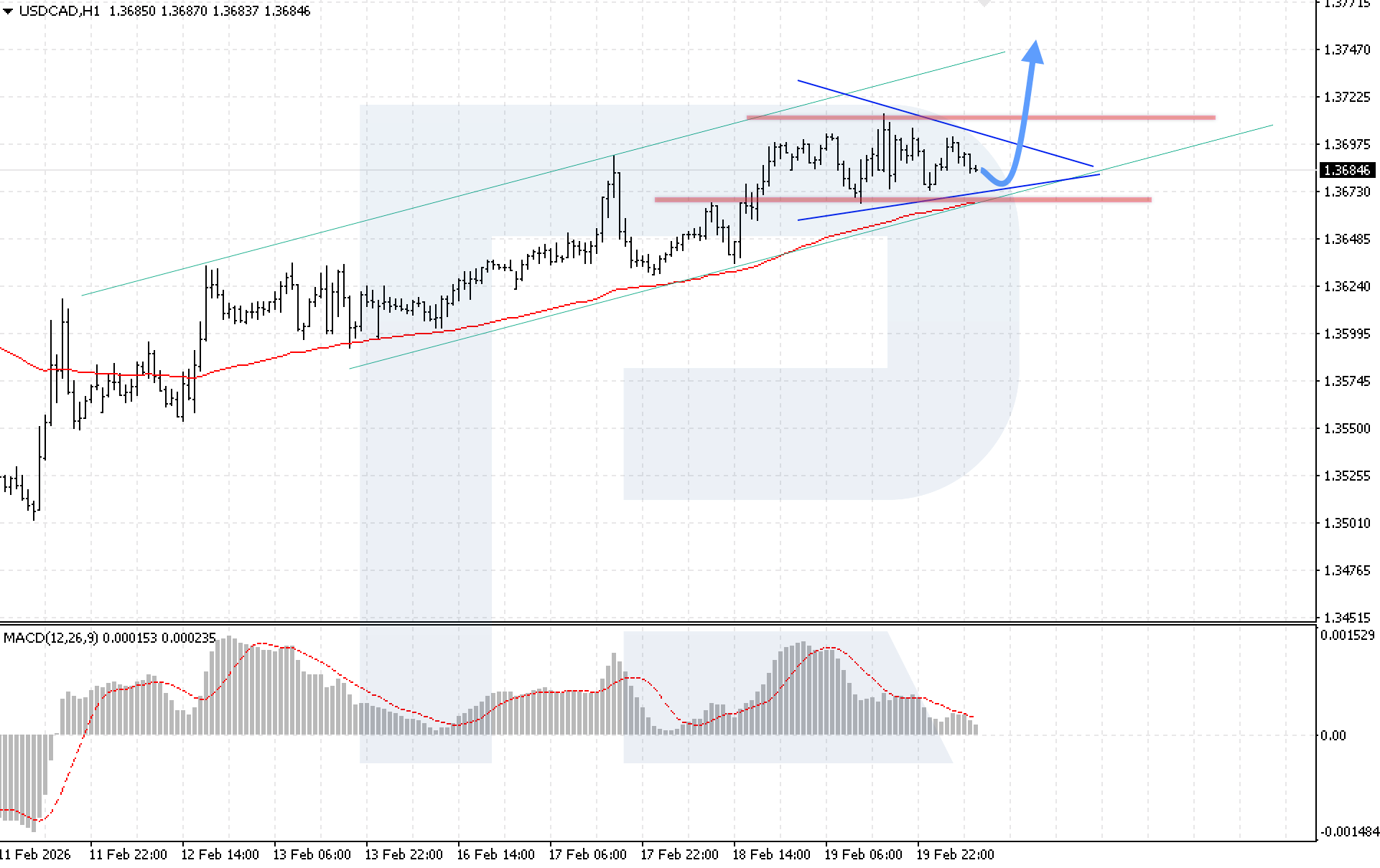 On the H1 chart of the USDCAD currency pair, the market continues to move within a correction while forming a Triangle pattern. Today, 20 February 2026, the baseline scenario suggests continued growth after a rebound from the pattern’s lower boundary, with a target at 1.3785.