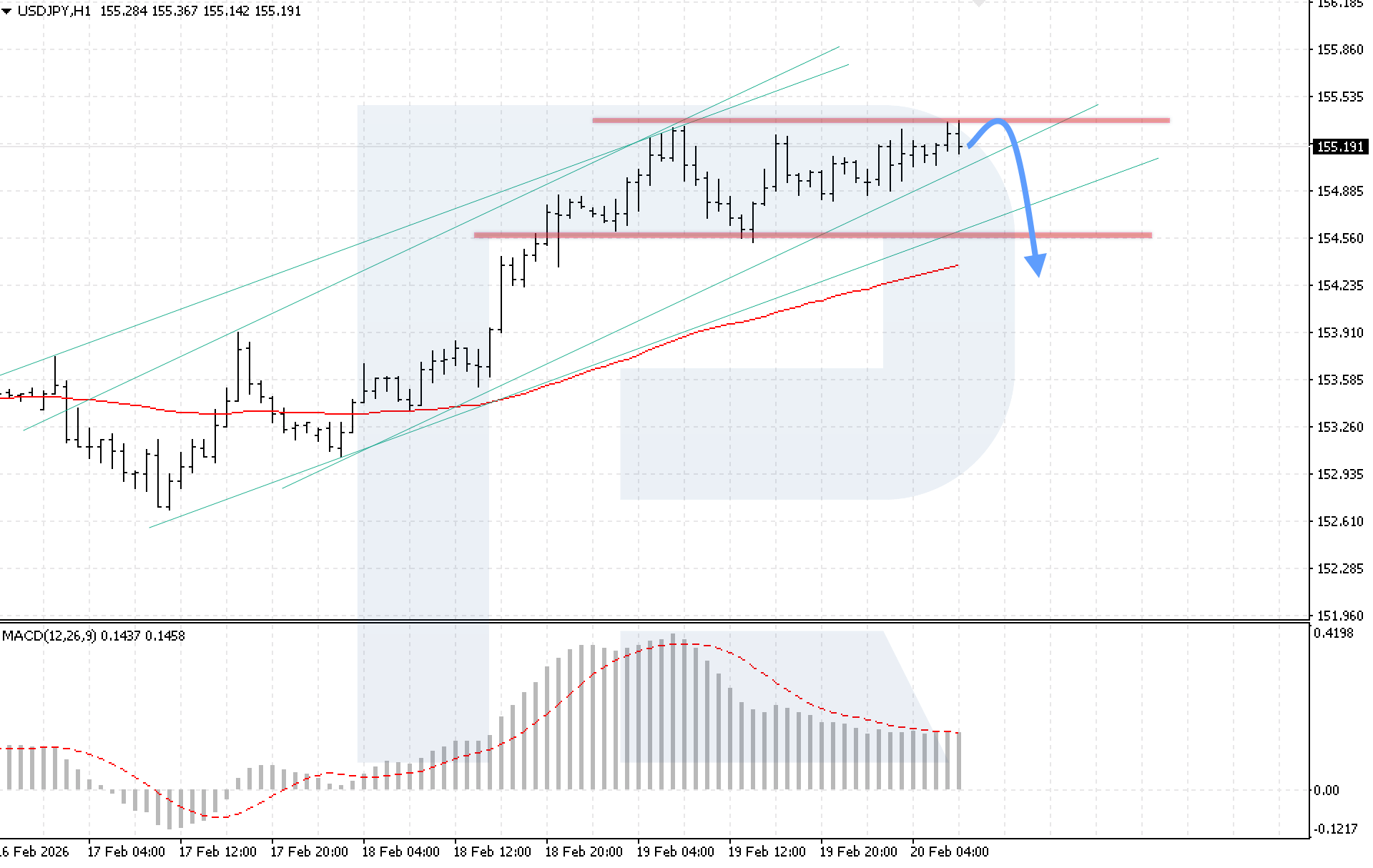 On the H1 chart of the USDJPY currency pair, the market is testing the key resistance level; however, there is a risk of a decline following the formation of a bearish divergence on MACD. Today, 20 February 2026, the baseline scenario remains a rebound from resistance, followed by a decline towards the 155.25 support level and a possible move further down to 154.25.