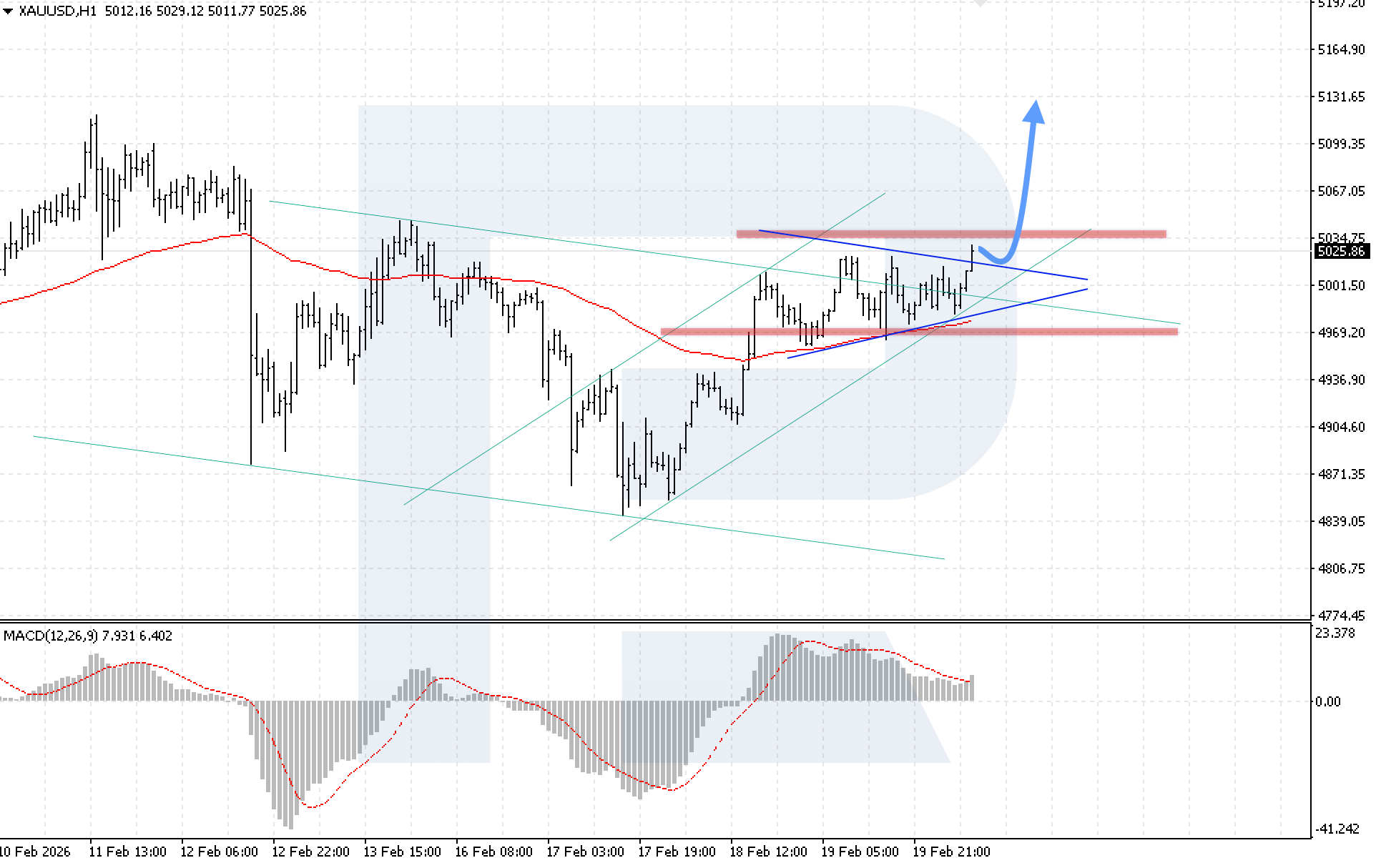 On the XAUUSD H1 chart, the market has secured positions above the upper boundary of the Triangle pattern, creating conditions for bullish momentum. Today, 20 February 2026, the baseline scenario suggests continued growth after a rebound from the pattern’s upper boundary, with a target at 5,135.