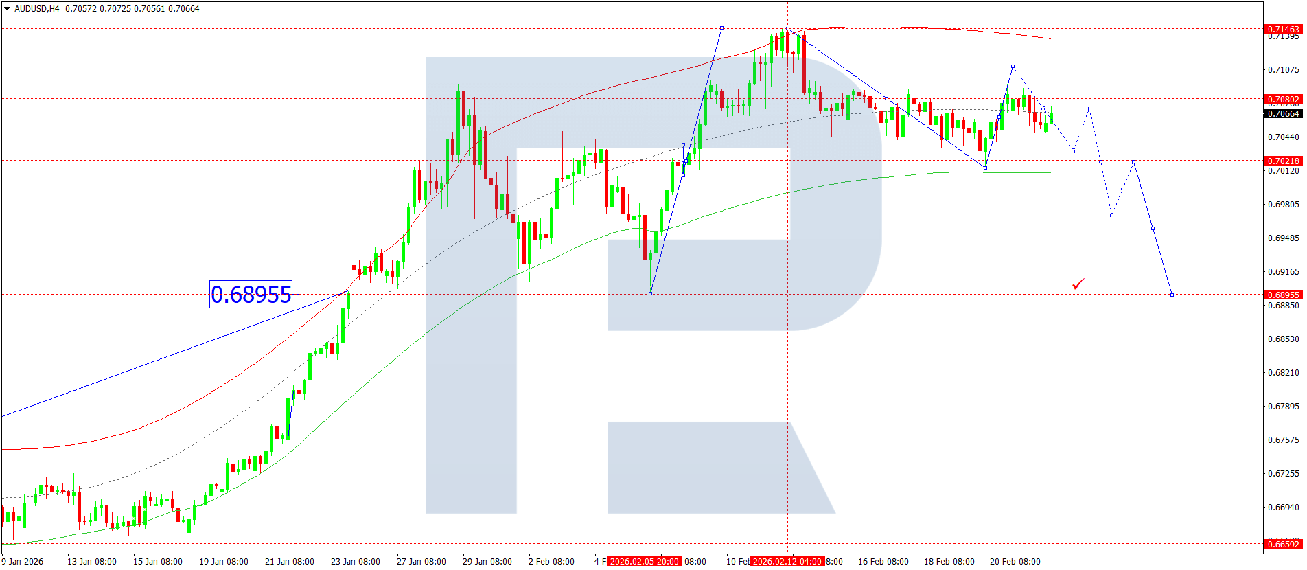 On the H4 chart of the AUDUSD pair, the market is forming a consolidation range around 0.7080. Today, 24 February 2026, if the price breaks out of this range upwards, the potential for growth towards 0.7150 will open. In case of a downward breakout, a decline towards 0.7020 is expected, followed by possible consolidation around that level.