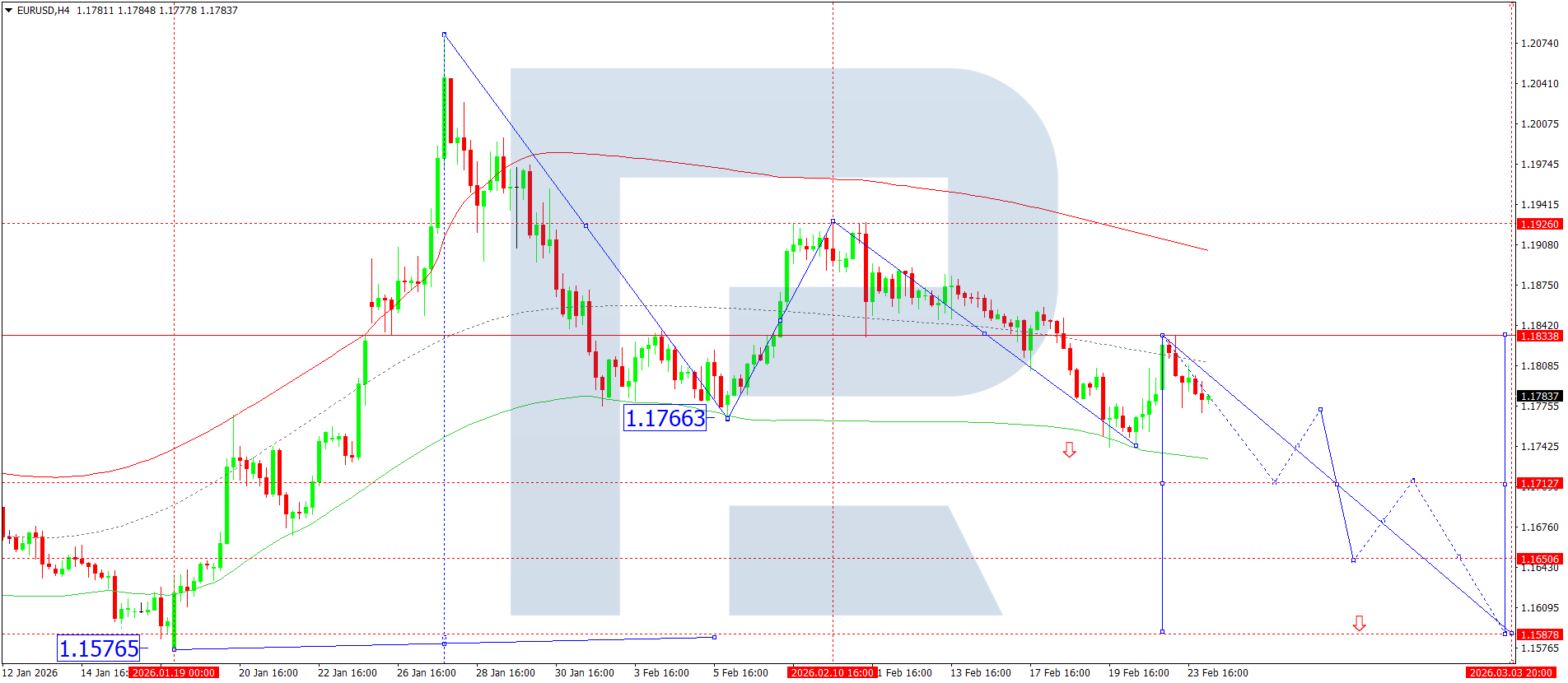 On the H4 chart of the EURUSD pair, the market completed a corrective wave to 1.1835 and has begun developing a downward structure towards 1.1717. Today, 24 February 2026, a breakout below 1.1777 is possible, with the decline continuing towards 1.1717. A breakout below this level would open the potential for an extended move towards 1.1650, a local target.