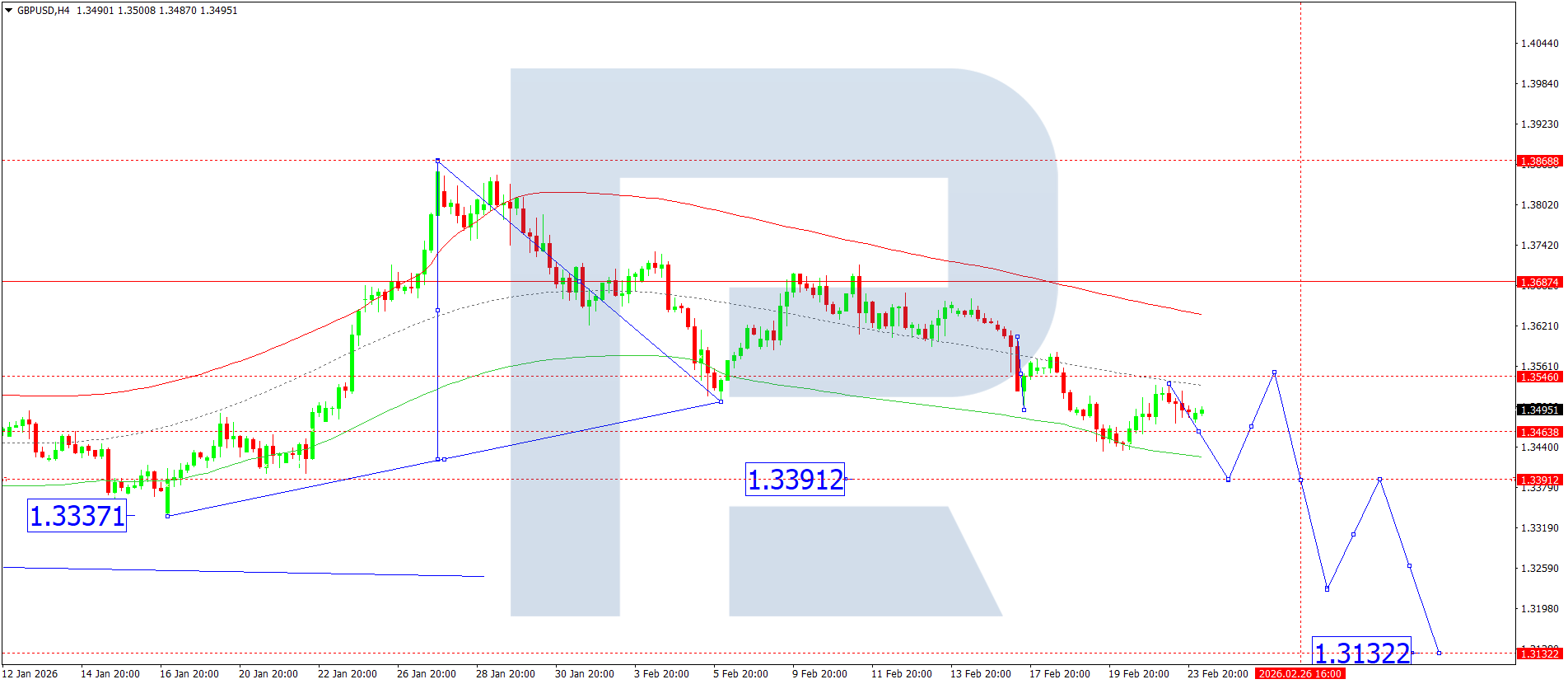 On the H4 chart of the GBPUSD pair, the market broke above 1.3515 and completed a corrective wave to 1.3536. Today, 24 February 2026, we expect continuation of the decline towards 1.3391. If this level is also broken, the potential for a move towards 1.3222 will open.