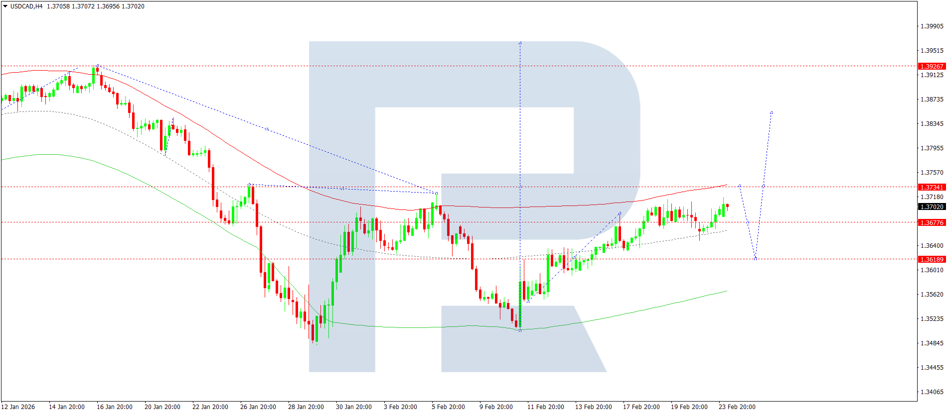 On the H4 chart of the USDCAD pair, the market is forming a growth structure towards 1.3737. Today, 24 February 2026, the price is expected to reach this target level. Afterwards, a correction towards 1.3636 is possible.