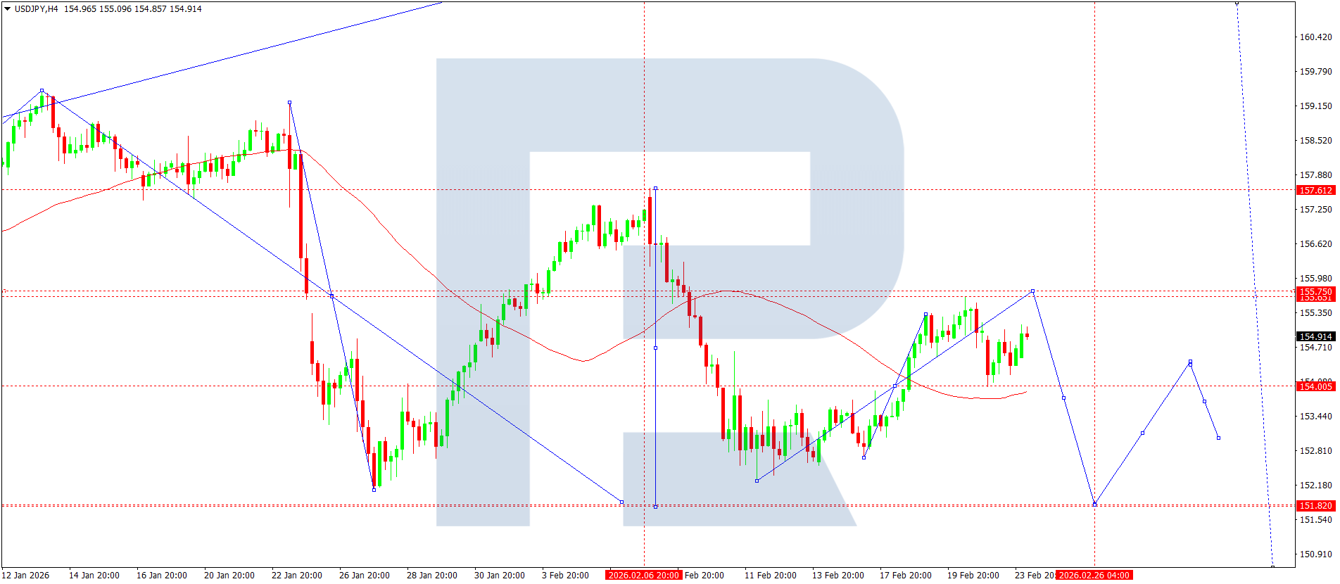 On the H4 chart of the USDJPY pair, the market is forming a consolidation range around 154.00. Today, 24 February 2026, further growth towards 155.75 is possible, followed by a decline to 151.80. Subsequently, another upward wave could develop, aiming for 155.75.