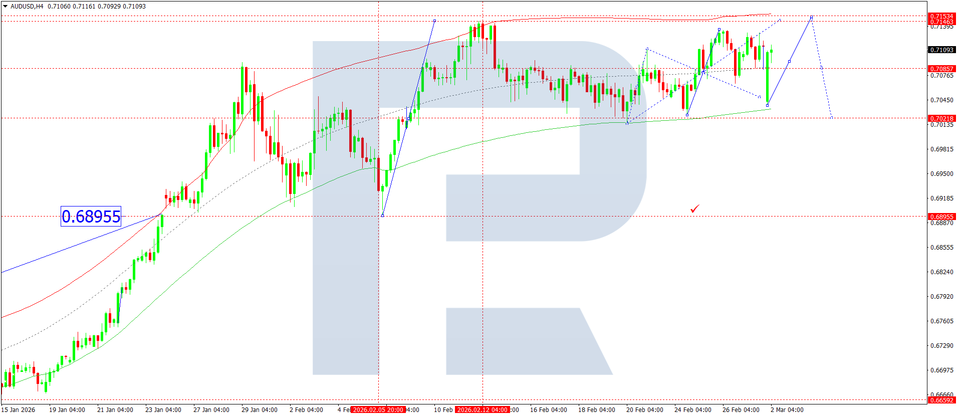 On the H4 chart of the AUDUSD pair, the market broke below 0.7117 and continues the decline wave towards 0.7040. Today, 2 March 2026, development of a consolidation range around 0.7085 is expected. In case of an upside breakout, the potential for growth to 0.7150 will open. In case of a downside breakout, development of a wave to 0.7028 is expected. Then the probability of a consolidation range developing around this level will be considered.